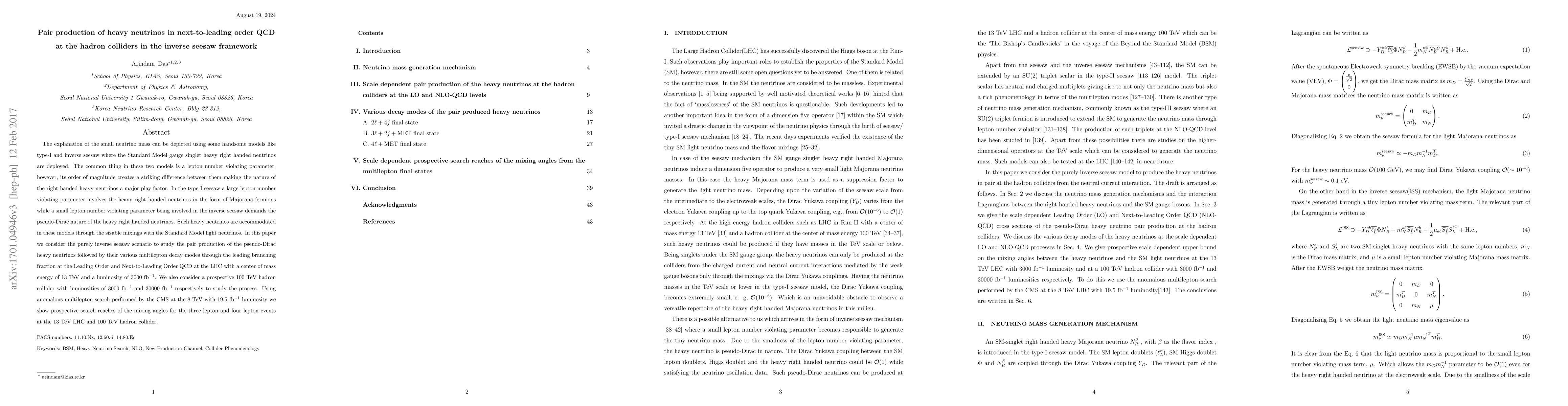 The explanation of the small neutrino mass can be depicted using some handsome models like type-I and inverse seesaw where the Standard Model gauge singlet heavy right handed neutrinos are deployed. The common thing in these two models is a lepton number violating parameter, however, its order of magnitude creates a striking difference between them making the nature of the right handed heavy neutrinos a major play factor. In the type-I seesaw a large lepton number violating parameter involves the heavy right handed neutrinos in the form of Majorana fermions while a small lepton number violating parameter being involved in the inverse seesaw demands the pseudo-Dirac nature of the heavy right handed neutrinos. Such heavy neutrinos are accommodated in these models through the sizable mixings with the Standard Model light neutrinos. In this paper we consider the purely inverse seesaw scenario to study the pair production of the pseudo-Dirac heavy neutrinos followed by their various multilepton decay modes through the leading branching fraction at the Leading Order and Next-to-Leading Order QCD at the LHC with a center of mass energy of 13 TeV and a luminosity of 3000 fb$^{-1}$. We also consider a prospective 100 TeV hadron collider with luminosities of 3000 fb$^{-1}$ and 30000 fb$^{-1}$ respectively to study the process. Using anomalous multilepton search performed by the CMS at the 8 TeV with 19.5 fb$^{-1}$ luminosity we show prospective search reaches of the mixing angles for the three lepton and four lepton events at the 13 TeV LHC and 100 TeV hadron collider.