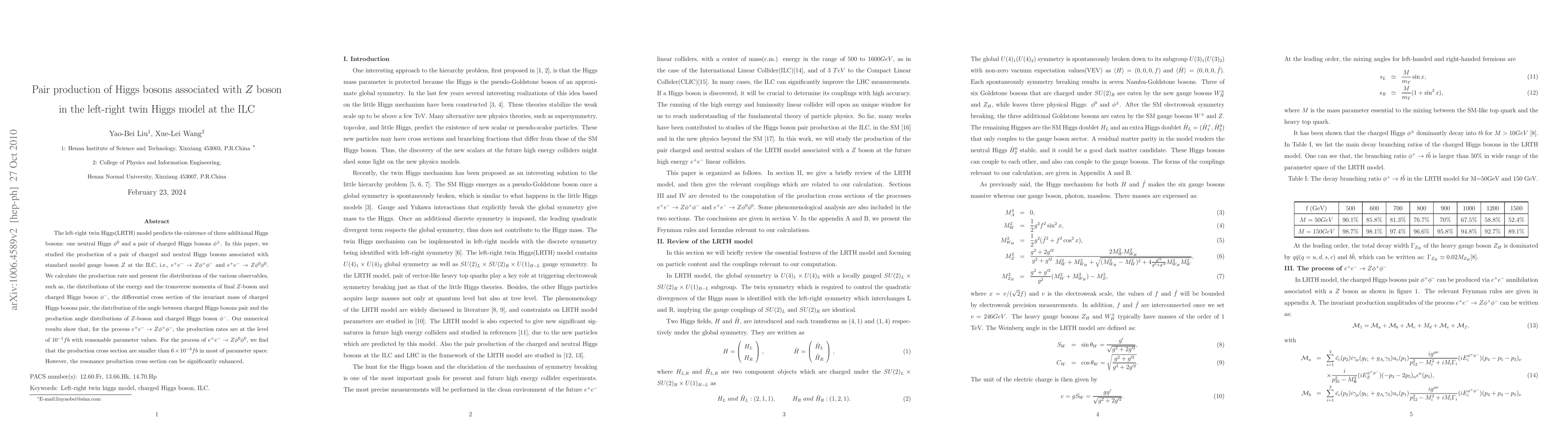 The left-right twin Higgs(LRTH) model predicts the existence of three additional Higgs bosons: one neutral Higgs $\phi^{0}$ and a pair of charged Higgs bosons $\phi^{\pm}$. In this paper, we studied the production of a pair of charged and neutral Higgs bosons associated with standard model gauge boson $Z$ at the ILC, i.e., $e^{+}e^{-}\rightarrow Z\phi^{+}\phi^{-}$ and $e^{+}e^{-}\rightarrow Z\phi^{0}\phi^{0}$. We calculate the production rate and present the distributions of the various observables, such as, the distributions of the energy and the transverse momenta of final $Z$-boson and charged Higgs boson $\phi^{-}$, the differential cross section of the invariant mass of charged Higgs bosons pair, the distribution of the angle between charged Higgs bosons pair and the production angle distributions of $Z$-boson and charged Higgs boson $\phi^{-}$. Our numerical results show that, for the process $e^{+}e^{-}\rightarrow Z\phi^{+}\phi^{-}$, the production rates are at the level of $10^{-1} fb$ with reasonable parameter values. For the process of $e^{+}e^{-}\rightarrow Z\phi^{0}\phi^{0}$, we find that the production cross section are smaller than $6\times 10^{-3} fb$ in most of parameter space. However, the resonance production cross section can be significantly enhanced.