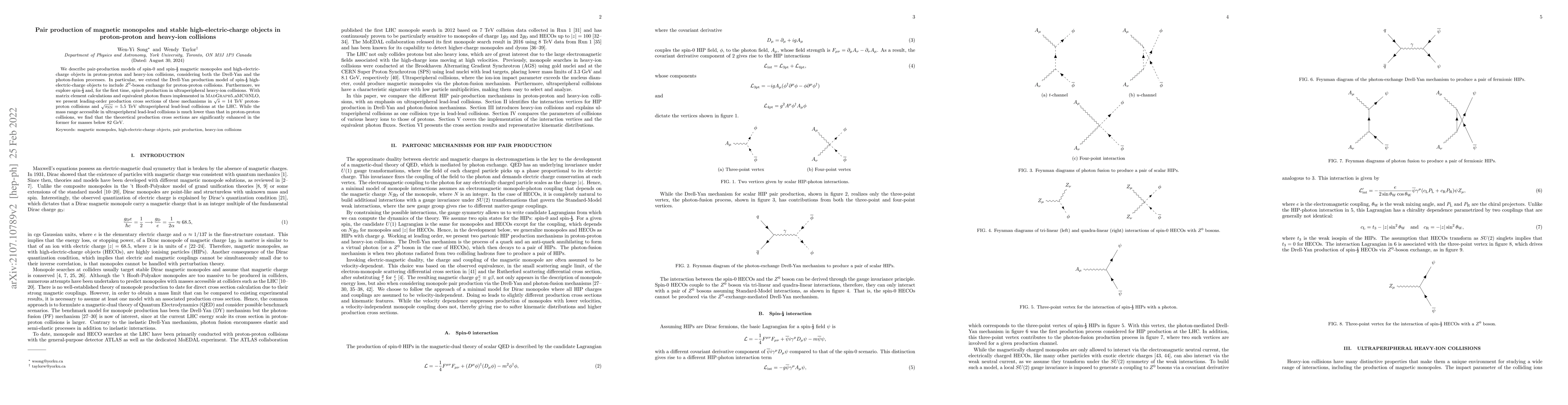 We describe pair-production models of spin-0 and spin-1/2 magnetic monopoles and high-electric-charge objects in proton-proton and heavy-ion collisions, considering both the Drell-Yan and the photon-fusion processes. In particular, we extend the Drell-Yan production model of spin-1/2 high-electric-charge objects to include $Z^0$-boson exchange for proton-proton collisions. Furthermore, we explore spin-1/2 and, for the first time, spin-0 production in ultraperipheral heavy-ion collisions. With matrix element calculations and equivalent photon fluxes implemented in MadGraph5_aMC@NLO, we present leading-order production cross sections of these mechanisms in $\sqrt{s} = 14$ TeV proton-proton collisions and $\sqrt{s_{\text{NN}}} = 5.5$ TeV ultraperipheral lead-lead collisions at the LHC. While the mass range accessible in ultraperipheral lead-lead collisions is much lower than that in proton-proton collisions, we find that the theoretical production cross sections are significantly enhanced in the former for masses below 82 GeV.