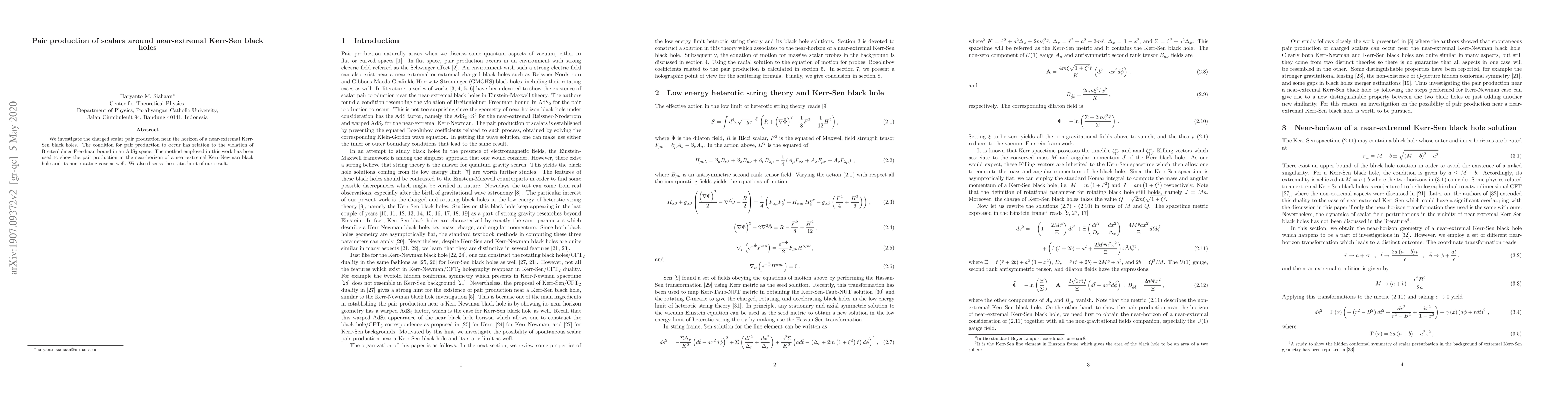 This research explores charged scalar pair production near the horizon of near-extremal Kerr-Sen black holes, showing that the process is linked to the violation of the Breitenlohner-Freedman bound in AdS$_2$ space. The method is also applied to similar phenomena in near-extremal Kerr-Newman and non-rotating black holes.