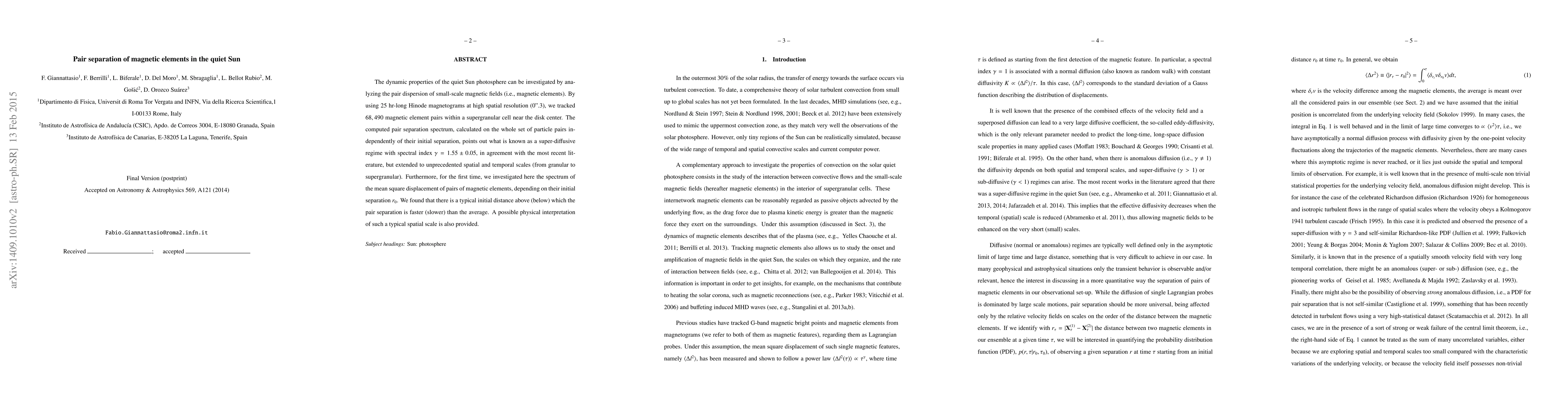 The dynamic properties of the quiet Sun photosphere can be investigated by analyzing the pair dispersion of small-scale magnetic fields (i.e., magnetic elements). By using $25$ hr-long Hinode magnetograms at high spatial resolution ($0".3$), we tracked $68,490$ magnetic element pairs within a supergranular cell near the disk center. The computed pair separation spectrum, calculated on the whole set of particle pairs independently of their initial separation, points out what is known as a super-diffusive regime with spectral index $\gamma=1.55\pm0.05$, in agreement with the most recent literature, but extended to unprecedented spatial and temporal scales (from granular to supergranular). Furthermore, for the first time, we investigated here the spectrum of the mean square displacement of pairs of magnetic elements, depending on their initial separation $r_0$. We found that there is a typical initial distance above (below) which the pair separation is faster (slower) than the average. A possible physical interpretation of such a typical spatial scale is also provided.