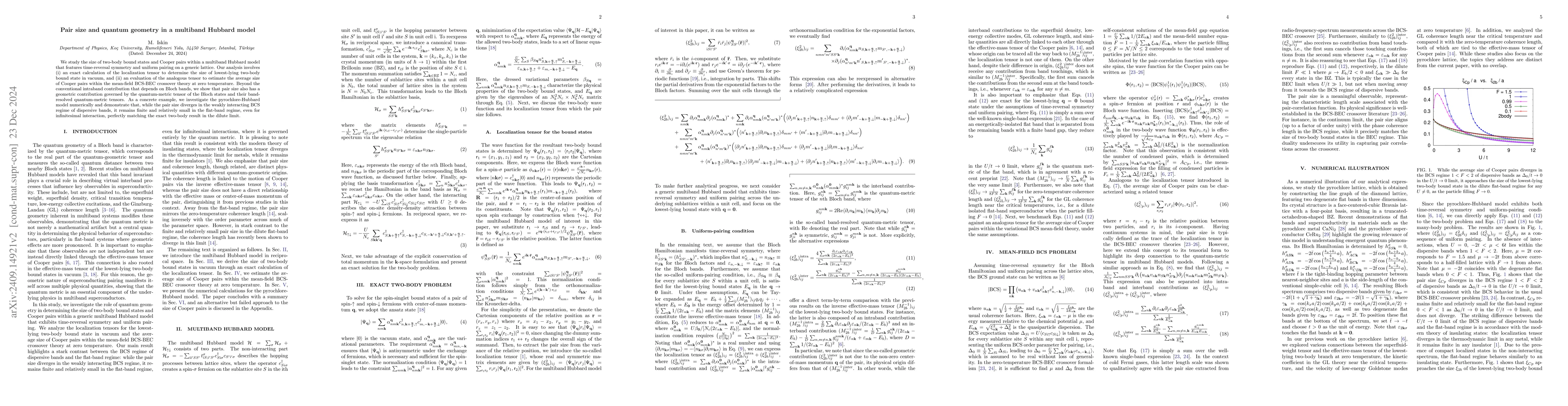 We study the size of two-body bound states and Cooper pairs within a multiband Hubbard model that features time-reversal symmetry and uniform pairing on a generic lattice. Our analysis involves (i) an exact calculation of the localization tensor to determine the size of lowest-lying two-body bound state in vacuum, and (ii) an evaluation of the average size of Cooper pairs using mean-field BCS-BEC crossover theory at zero temperature. Beyond the conventional intraband contribution that depends on Bloch bands, we show that pair size also has a geometric contribution governed by the quantum-metric tensor of the Bloch states and their band-resolved quantum-metric tensors. As a concrete example, we investigate the pyrochlore-Hubbard model numerically and demonstrate that, while the pair size diverges in the weakly interacting BCS regime, it remains finite and relatively small in the flat-band regime, even for infinitesimal interaction, perfectly matching the exact two-body result in the dilute limit.