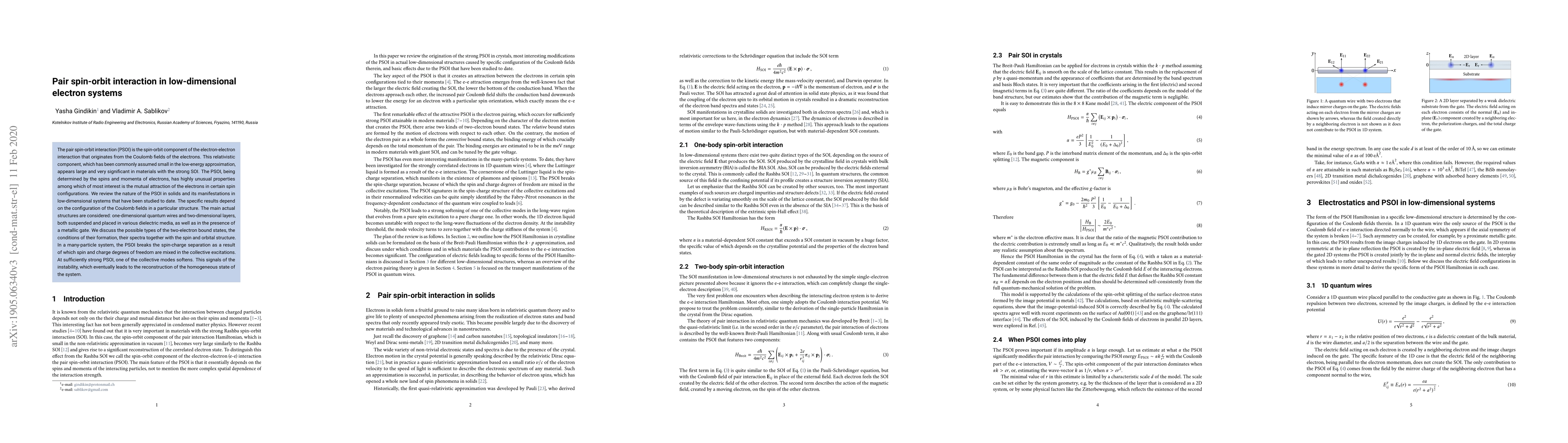 This paper reviews the significant pair spin-orbit interaction (PSOI) in low-dimensional electron systems, highlighting its unusual properties and manifestations in quantum wires and layers. It discusses the formation conditions and spectra of two-electron bound states, and how PSOI leads to the mixing of spin and charge degrees of freedom, potentially causing instability and system reconstruction.