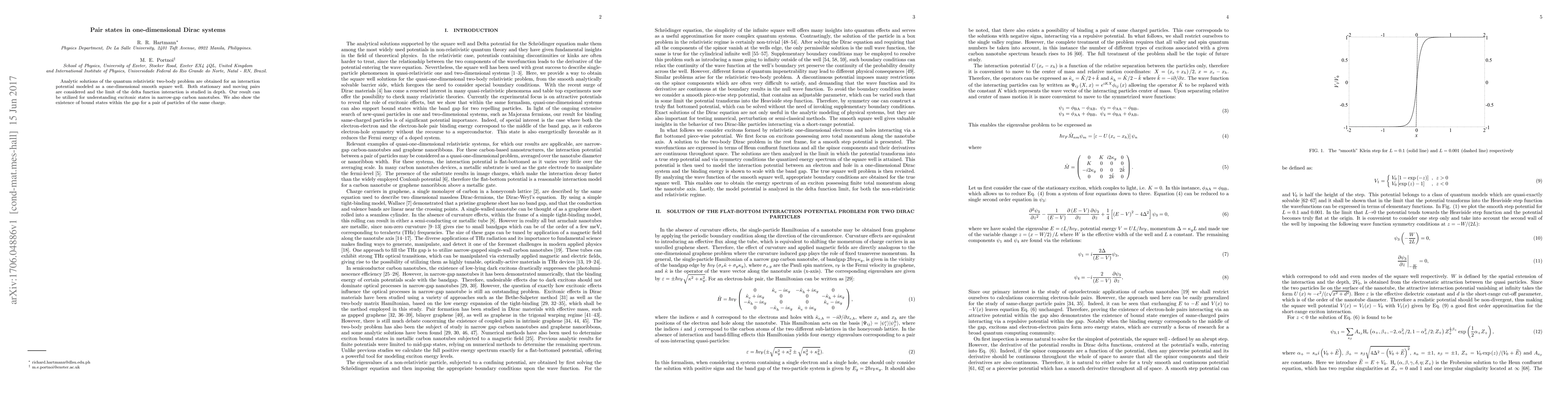 This paper presents analytic solutions for the quantum relativistic two-body problem in one-dimensional Dirac systems with a smooth square well potential, exploring both stationary and moving pairs. The study also investigates the limit of {\delta}-function interactions and reveals bound states within the gap for same-charge particle pairs, useful for understanding excitonic states in narrow-gap carbon nanotubes.
