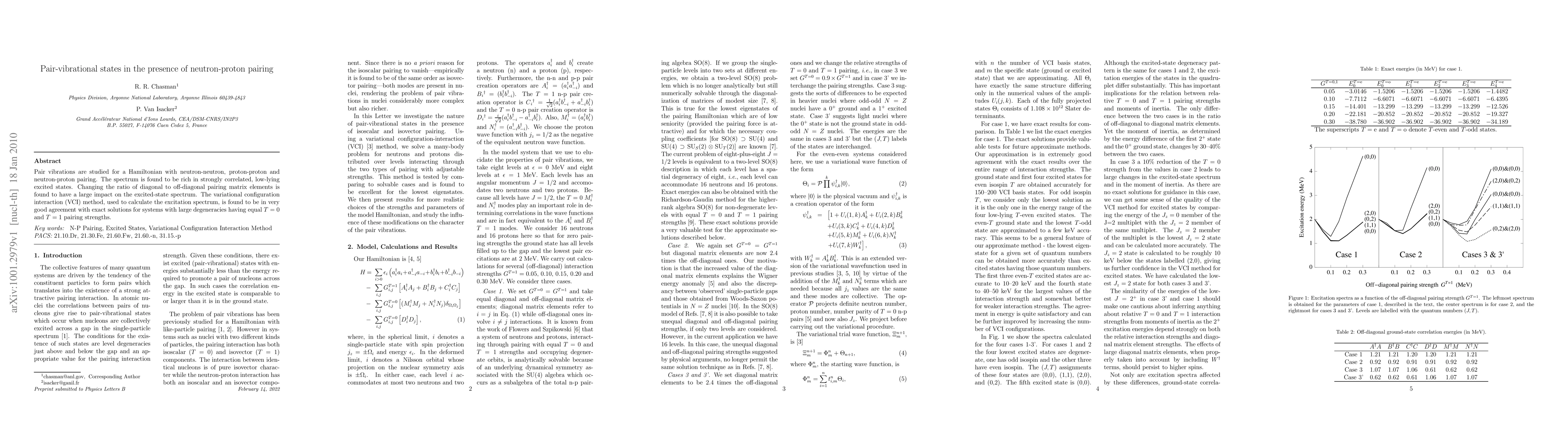 This paper explores pair vibrations in a Hamiltonian featuring neutron-proton pairing, revealing a spectrum rich in low-lying, strongly correlated excited states. The study finds significant variations in the excited-state spectrum with changes in the ratio of diagonal to off-diagonal pairing matrix elements, and the variational configuration interaction method shows excellent agreement with exact solutions for systems with large degeneracies.