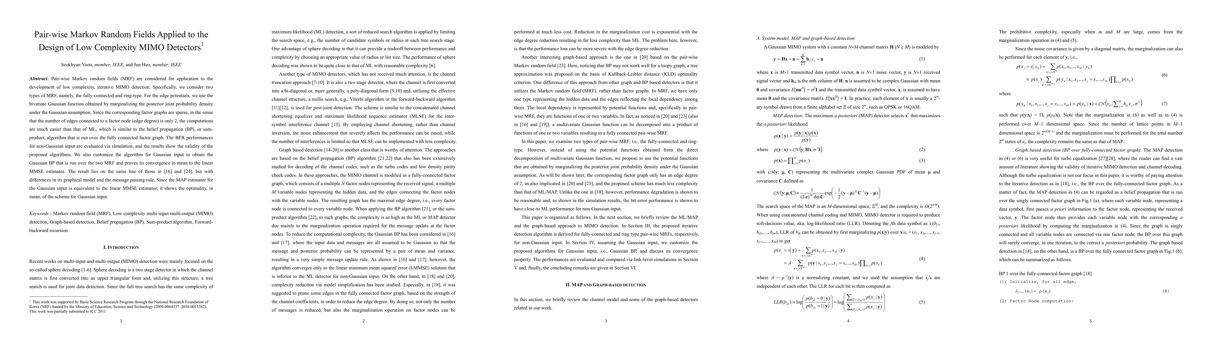 Pair-wise Markov random fields (MRF) are considered for application to the development of low complexity, iterative MIMO detection. Specifically, we consider two types of MRF, namely, the fully-connected and ring-type. For the edge potentials, we use the bivariate Gaussian function obtained by marginalizing the posterior joint probability density under the Gaussian assumption. Since the corresponding factor graphs are sparse, in the sense that the number of edges connected to a factor node (edge degree) is only 2, the computations are much easier than that of ML, which is similar to the belief propagation (BP), or sum-product, algorithm that is run over the fully connected factor graph. The BER performances for non-Gaussian input are evaluated via simulation, and the results show the validity of the proposed algorithms. We also customize the algorithm for Gaussian input to obtain the Gaussian BP that is run over the two MRF and proves its convergence in mean to the linear MMSE estimates. The result lies on the same line of those in [16] and [24], but with differences in its graphical model and the message passing rule. Since the MAP estimator for the Gaussian input is equivalent to the linear MMSE estimator, it shows the optimality, in mean, of the scheme for Gaussian input.