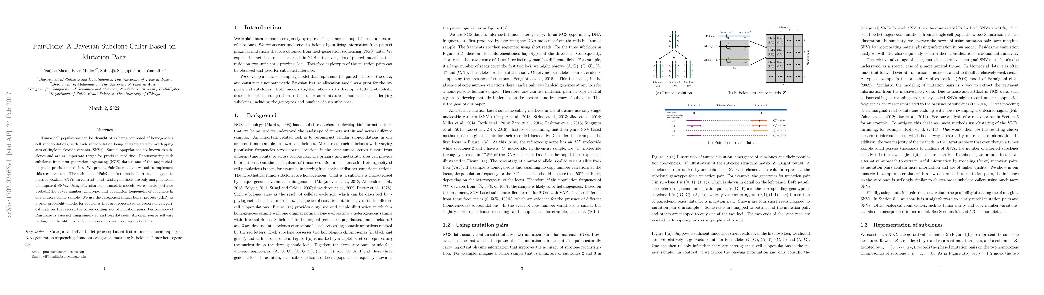 Tumor cell populations can be thought of as being composed of homogeneous cell subpopulations, with each subpopulation being characterized by overlapping sets of single nucleotide variants (SNVs). Such subpopulations are known as subclones and are an important target for precision medicine. Reconstructing such subclones from next-generation sequencing (NGS) data is one of the major challenges in precision medicine. We present PairClone as a new tool to implement this reconstruction. The main idea of PairClone is to model short reads mapped to pairs of proximal SNVs. In contrast, most existing methods use only marginal reads for unpaired SNVs. Using Bayesian nonparametric models, we estimate posterior probabilities of the number, genotypes and population frequencies of subclones in one or more tumor sample. We use the categorical Indian buffet process (cIBP) as a prior probability model for subclones that are represented as vectors of categorical matrices that record the corresponding sets of mutation pairs. Performance of PairClone is assessed using simulated and real datasets. An open source software package can be obtained at http://www.compgenome.org/pairclone.