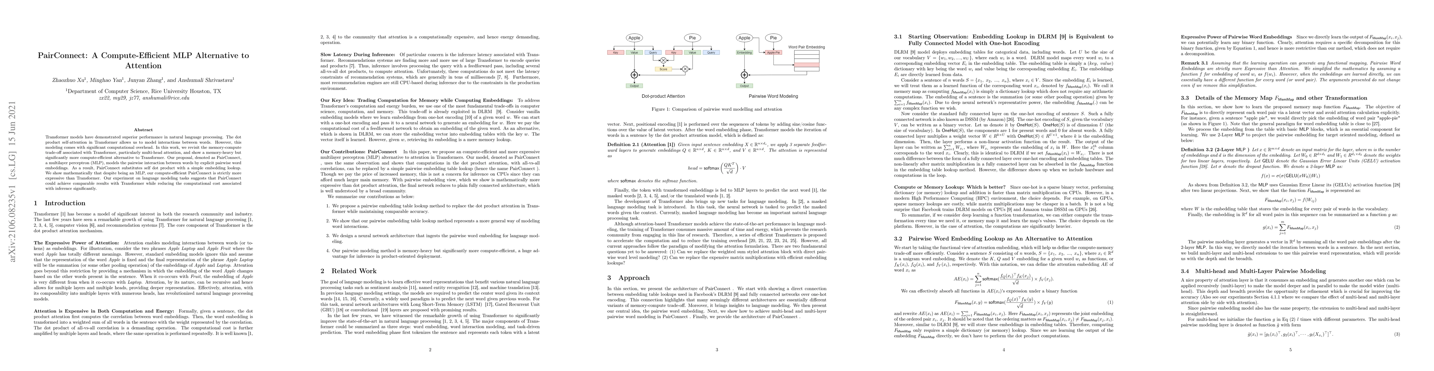 Transformer models have demonstrated superior performance in natural language processing. The dot product self-attention in Transformer allows us to model interactions between words. However, this modeling comes with significant computational overhead. In this work, we revisit the memory-compute trade-off associated with Transformer, particularly multi-head attention, and show a memory-heavy but significantly more compute-efficient alternative to Transformer. Our proposal, denoted as PairConnect, a multilayer perceptron (MLP), models the pairwise interaction between words by explicit pairwise word embeddings. As a result, PairConnect substitutes self dot product with a simple embedding lookup. We show mathematically that despite being an MLP, our compute-efficient PairConnect is strictly more expressive than Transformer. Our experiment on language modeling tasks suggests that PairConnect could achieve comparable results with Transformer while reducing the computational cost associated with inference significantly.
