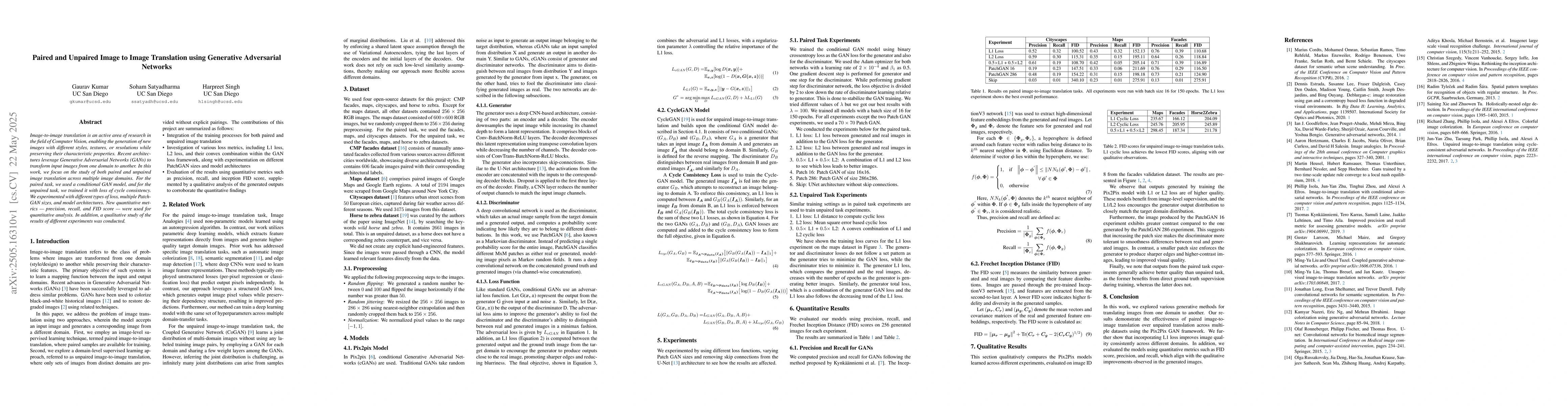 This research paper explores image-to-image translation using Generative Adversarial Networks for paired and unpaired tasks, improving style, texture, or resolution preservation in images.