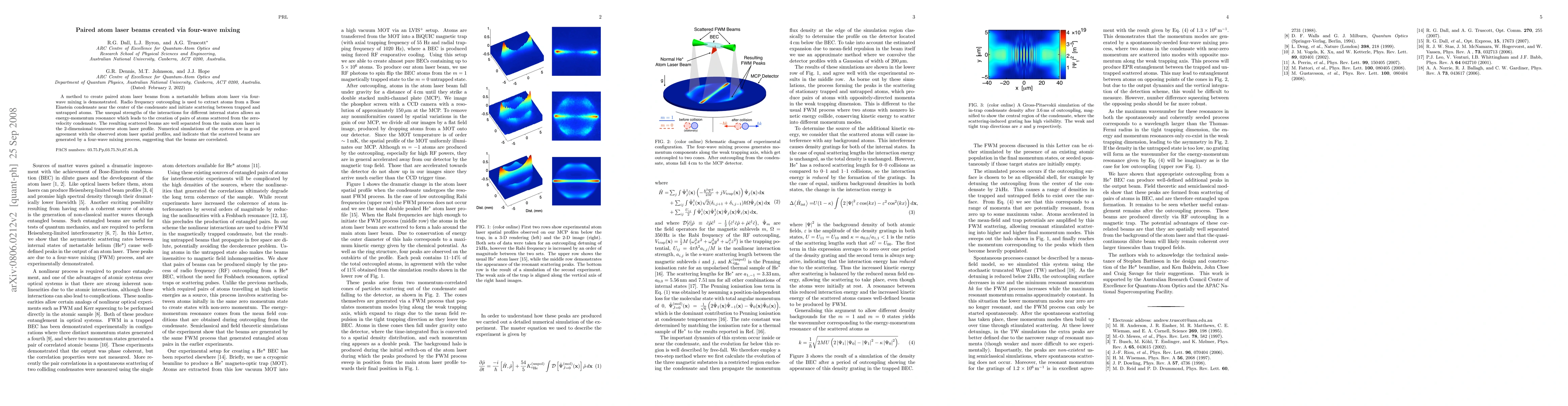 This paper demonstrates a method for generating paired atom laser beams from a helium atom laser via four-wave mixing, utilizing radio frequency outcoupling to initiate scattering. The resulting beams are well separated from the main laser and are shown to be correlated, with numerical simulations confirming the four-wave mixing process.