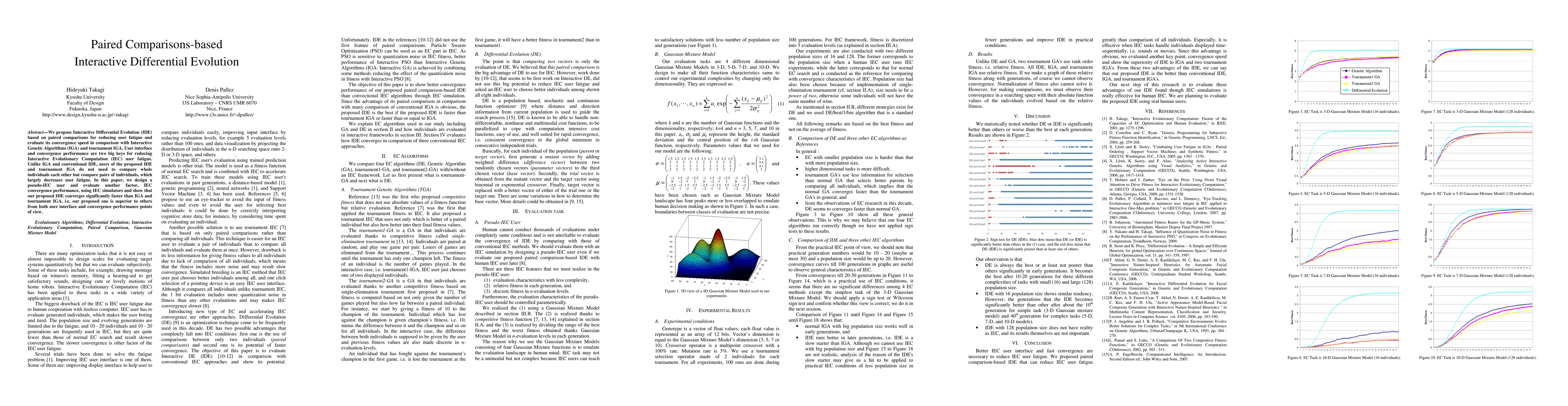 We propose Interactive Differential Evolution (IDE) based on paired comparisons for reducing user fatigue and evaluate its convergence speed in comparison with Interactive Genetic Algorithms (IGA) and tournament IGA. User interface and convergence performance are two big keys for reducing Interactive Evolutionary Computation (IEC) user fatigue. Unlike IGA and conventional IDE, users of the proposed IDE and tournament IGA do not need to compare whole individuals each other but compare pairs of individuals, which largely decreases user fatigue. In this paper, we design a pseudo-IEC user and evaluate another factor, IEC convergence performance, using IEC simulators and show that our proposed IDE converges significantly faster than IGA and tournament IGA, i.e. our proposed one is superior to others from both user interface and convergence performance points of view.
