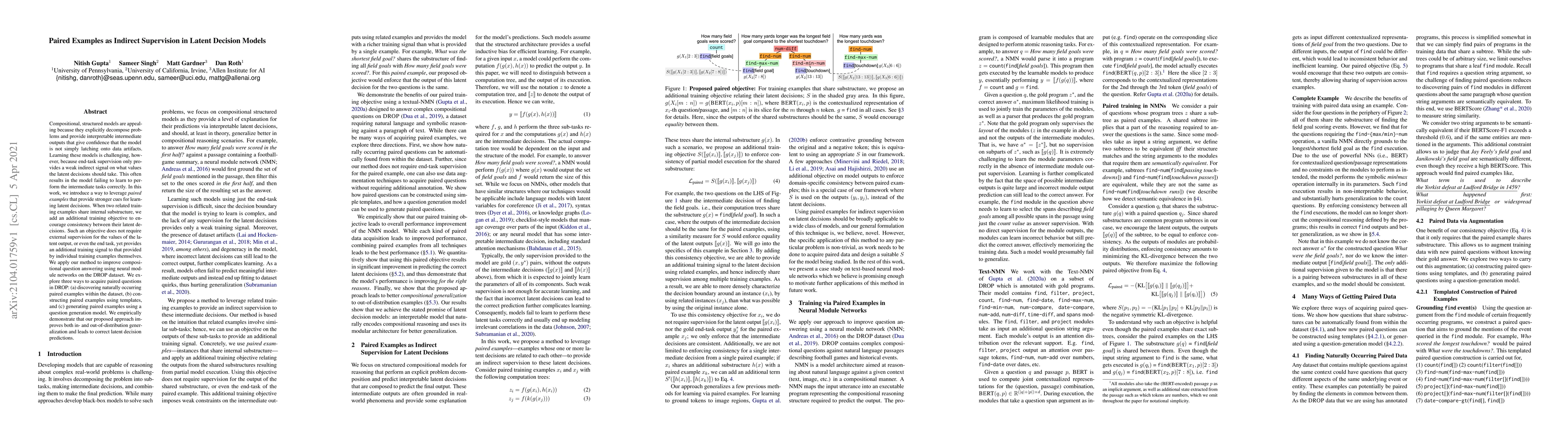 This paper proposes leveraging paired examples to provide stronger indirect supervision for learning latent decisions in structured models, enhancing interpretability and performance. The method introduces an additional training objective to encourage consistency between related training examples, improving compositional question answering on the DROP dataset.