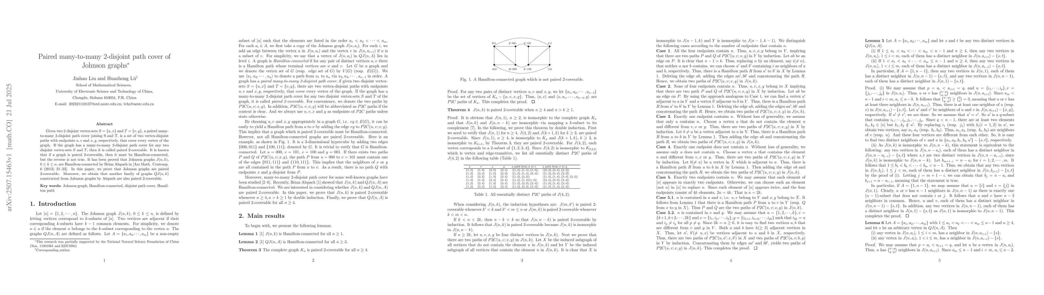 Given two 2 disjoint vertex-sets $S=\{u,x\}$ and $T=\{v,y\}$, a paired many-to-many 2-disjoint path cover joining S and T, is a set of two vertex-disjoint paths with endpoints $u,v$ and $x,y$, respectively, that cover every vertex of the graph. If the graph has a many-to-many 2-disjoint path cover for any two disjoint vertex-sets $S$ and $T$, then it is called paired 2-coverable. It is known that if a graph is paired 2-coverable, then it must be Hamilton-connected, but the reverse is not true. It has been proved that Johnson graphs $J(n,k)$, $0\le k\le n$, are Hamilton-connected by Brian Alspach in [Ars Math. Contemp. 6 (2013) 21--23]. In this paper, we prove that Johnson graphs are paired 2-coverable. Moreover, we obtain that another family of graphs $QJ(n,k)$ constructed from Johnson graphs by Alspach are also paired 2-coverable.