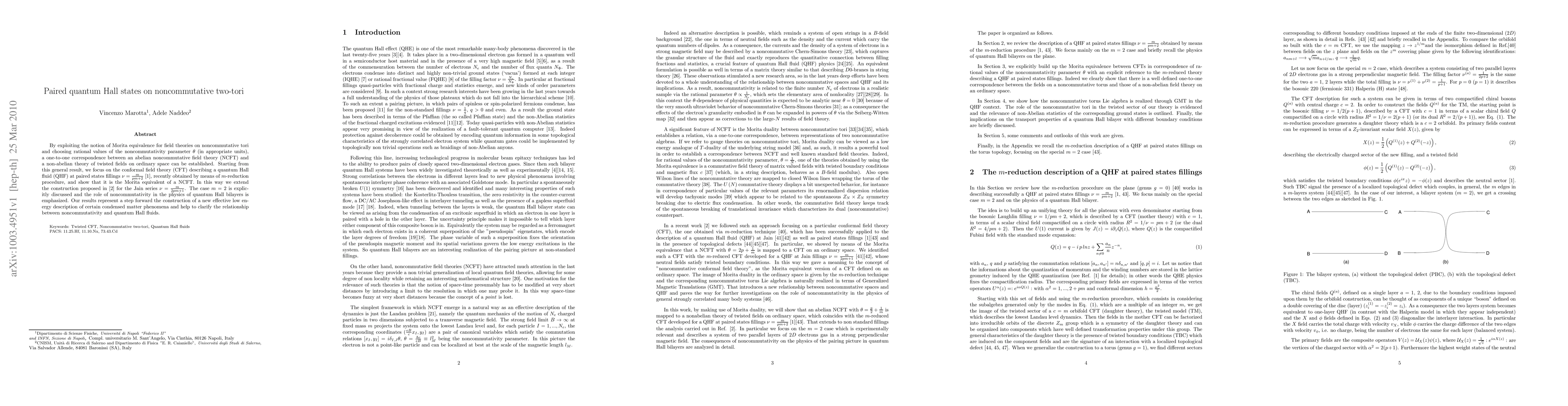 By exploiting the notion of Morita equivalence for field theories on noncommutative tori and choosing rational values of the noncommutativity parameter theta (in appropriate units), a one-to-one correspondence between an abelian noncommutative field theory (NCFT) and a non-abelian theory of twisted fields on ordinary space can be established. Starting from this general result, we focus on the conformal field theory (CFT) describing a quantum Hall fluid (QHF) at paired states fillings nu =m/pm+2, recently obtained by means of m-reduction procedure, and show that it is the Morita equivalent of a NCFT. In this way we extend the construction proposed in a previous work (V. Marotta, A. Naddeo, Nucl. Phys. B 810(2009) 575) for the Jain series nu =m/2pm+1. The case m=2 is explicitly discussed and the role of noncommutativity in the physics of quantum Hall bilayers is emphasized. Our results represent a step forward the construction of a new effective low energy description of certain condensed matter phenomena and help to clarify the relationship between noncommutativity and quantum Hall fluids.