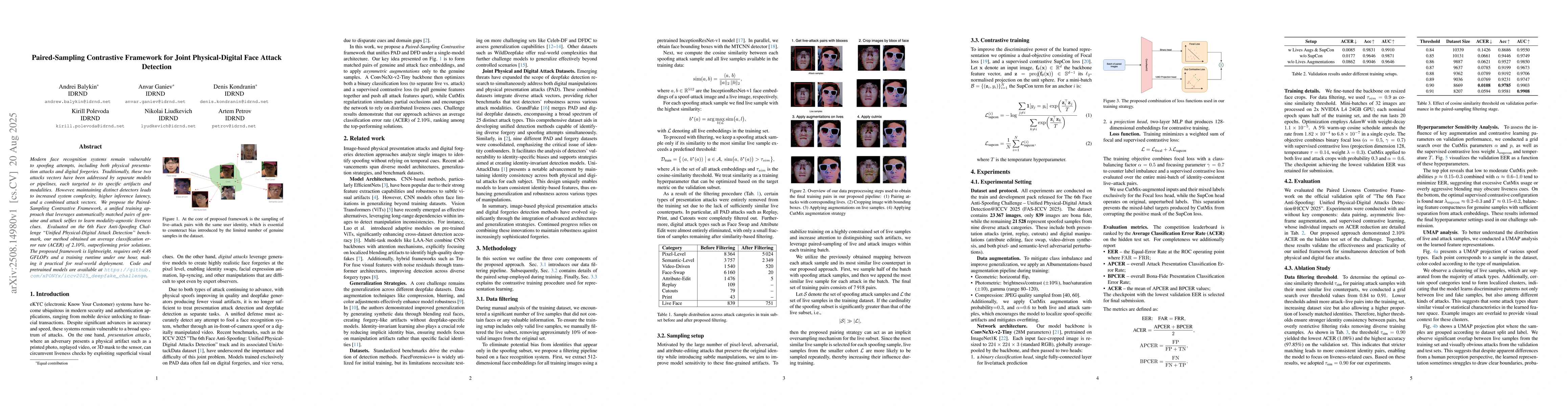 Modern face recognition systems remain vulnerable to spoofing attempts, including both physical presentation attacks and digital forgeries. Traditionally, these two attack vectors have been handled by separate models, each targeting its own artifacts and modalities. However, maintaining distinct detectors increases system complexity and inference latency and leaves systems exposed to combined attack vectors. We propose the Paired-Sampling Contrastive Framework, a unified training approach that leverages automatically matched pairs of genuine and attack selfies to learn modality-agnostic liveness cues. Evaluated on the 6th Face Anti-Spoofing Challenge Unified Physical-Digital Attack Detection benchmark, our method achieves an average classification error rate (ACER) of 2.10 percent, outperforming prior solutions. The framework is lightweight (4.46 GFLOPs) and trains in under one hour, making it practical for real-world deployment. Code and pretrained models are available at https://github.com/xPONYx/iccv2025_deepfake_challenge.