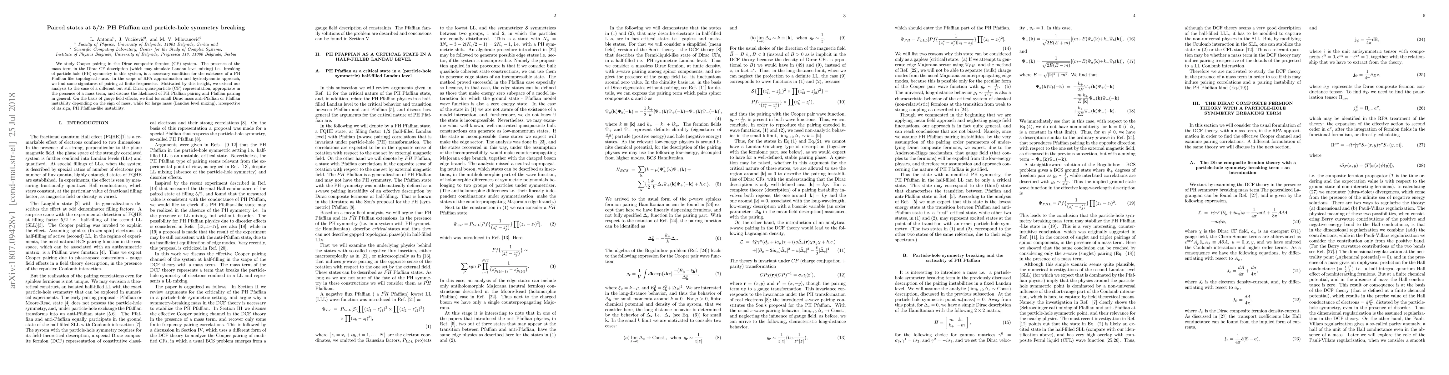 We study Cooper pairing in the Dirac composite fermion (CF) system. The presence of the mass term in the Dirac CF description (which may simulate Landau level mixing) i.e. breaking of particle-hole (PH) symmetry in this system, is a necessary condition for the existence of a PH Pfaffian-like topological state. In the scope of RPA approximation and hydrodynamic approach, we find some signatures of pairing at finite frequencies. Motivated by this insight, we extend our analysis to the case of a different but still Dirac quasi-particle (CF) representation, appropriate in the presence of a mass term, and discuss the likelihood of PH Pfaffian pairing and Pfaffian pairing in general. On the basis of gauge field effects, we find for small Dirac mass anti-Pfaffian or Pfaffian instability depending on the sign of mass, while for large mass (Landau level mixing), irrespective of its sign, PH Pfaffian-like instability.