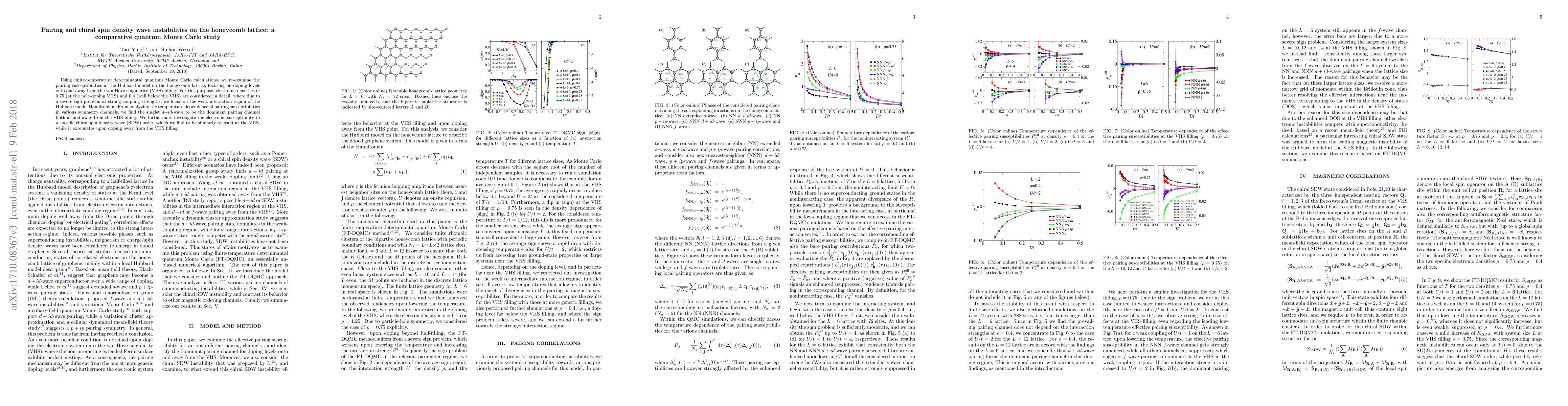 Using finite-temperature determinantal quantum Monte Carlo calculations, we re-examine the pairing susceptibilities in the Hubbard model on the honeycomb lattice, focusing on doping levels onto and away from the van Hove singularity (VHS) filling. For this purpose, electronic densities of $0.75$ (at the hole-doping VHS) and $0.4$ (well below the VHS) are considered in detail, where due to a severe sign problem at strong coupling strengths, we focus on the weak interaction region of the Hubbard model Hamiltonian. From analyzing the temperature dependence of pairing susceptibilities in various symmetry channels, we find the singlet $d$+$id$-wave to be the dominant pairing channel both at and away from the VHS filling. We furthermore investigate the electronic susceptibility to a specific chiral spin density wave (SDW) order, which we find to be similarly relevant at the VHS, while it extenuates upon doping away from the VHS filling.