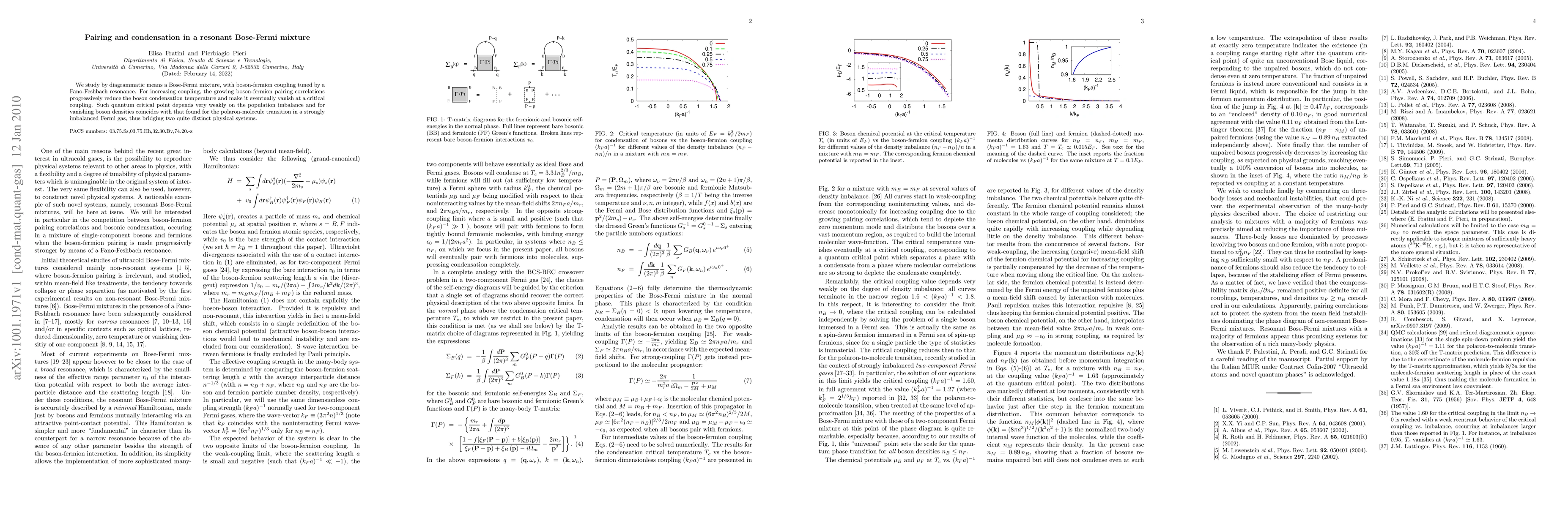 We study by diagrammatic methods a mixture of single-component bosons and fermions, with boson-fermion coupling tuned by a Fano-Feshbach resonance. For increasing coupling, the growing boson-fermion pairing correlations progressively reduce the boson condensation temperature and make it eventually vanish at a critical coupling. Such quantum critical point depends very weakly on the population imbalance and for vanishing boson densities coincides with that found for the polaron-molecule transition in a strongly imbalanced Fermi gas, thus bridging two quite distinct physical systems.