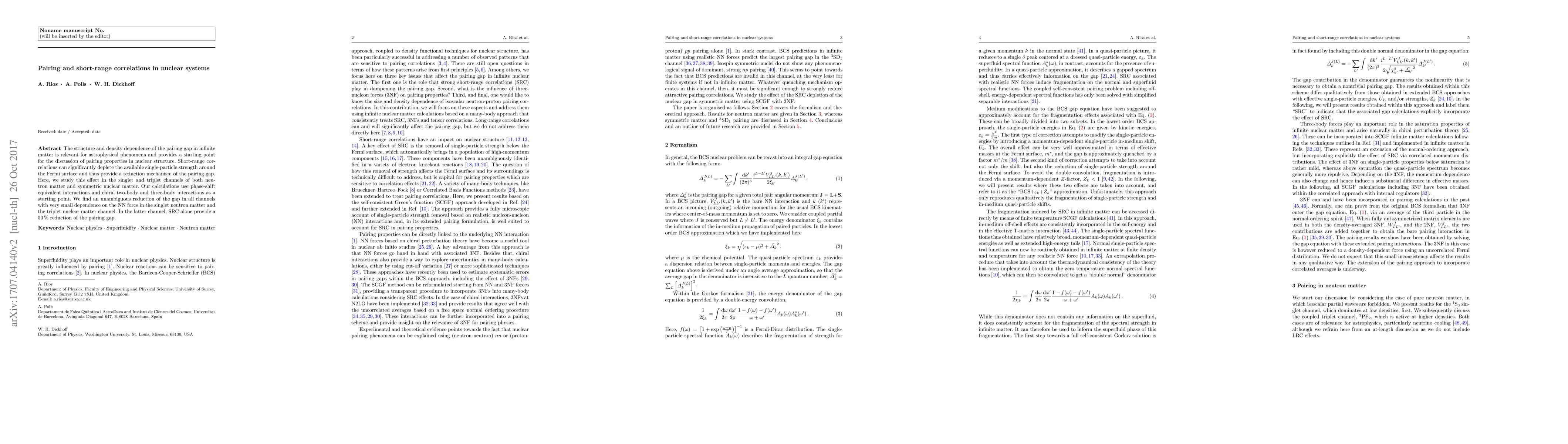 This paper investigates the impact of short-range correlations on the pairing gap in nuclear systems, finding a significant reduction in the gap due to these correlations, particularly in the triplet nuclear matter channel where they account for a 50% reduction. The study uses phase-shift equivalent and chiral interactions to explore the singlet and triplet channels in neutron and symmetric nuclear matter.
