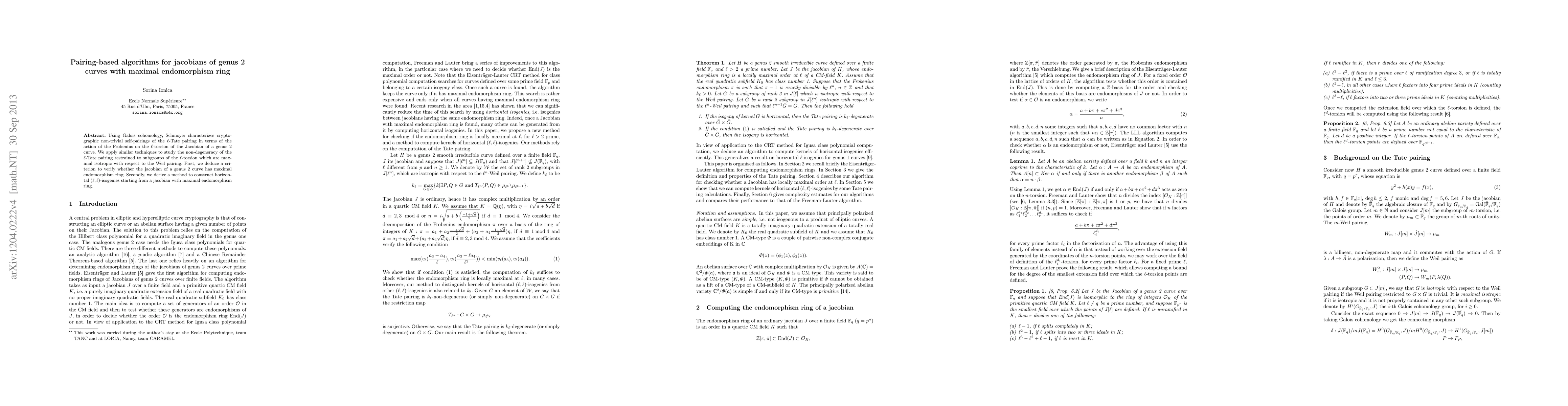 Using Galois cohomology, Schmoyer characterizes cryptographic non-trivial self-pairings of the $\ell$-Tate pairing in terms of the action of the Frobenius on the $\ell$-torsion of the Jacobian of a genus 2 curve. We apply similar techniques to study the non-degeneracy of the $\ell$-Tate pairing restrained to subgroups of the $\ell$-torsion which are maximal isotropic with respect to the Weil pairing. First, we deduce a criterion to verify whether the jacobian of a genus 2 curve has maximal endomorphism ring. Secondly, we derive a method to construct horizontal $(\ell,\ell)$-isogenies starting from a jacobian with maximal endomorphism ring.