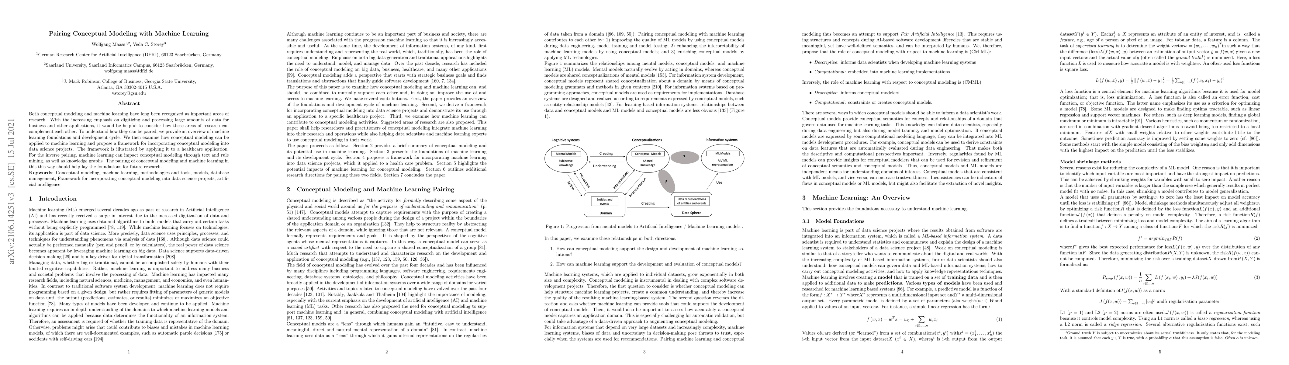 Both conceptual modeling and machine learning have long been recognized as important areas of research. With the increasing emphasis on digitizing and processing large amounts of data for business and other applications, it would be helpful to consider how these areas of research can complement each other. To understand how they can be paired, we provide an overview of machine learning foundations and development cycle. We then examine how conceptual modeling can be applied to machine learning and propose a framework for incorporating conceptual modeling into data science projects. The framework is illustrated by applying it to a healthcare application. For the inverse pairing, machine learning can impact conceptual modeling through text and rule mining, as well as knowledge graphs. The pairing of conceptual modeling and machine learning in this this way should help lay the foundations for future research.