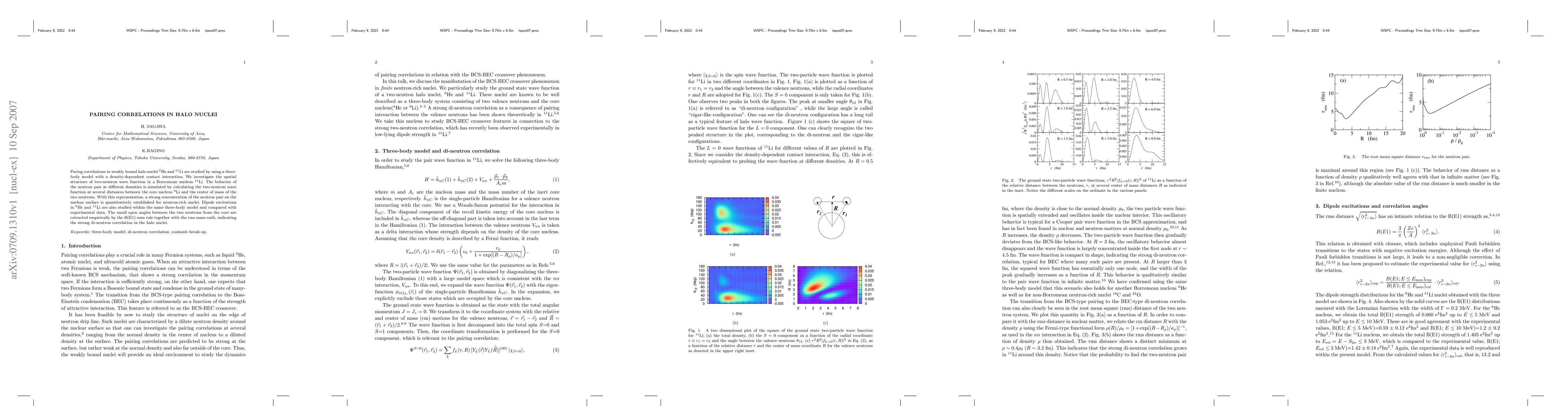 This paper investigates pairing correlations in halo nuclei $^{6}$He and $^{11}$Li using a three-body model with a density-dependent contact interaction, establishing strong neutron pair concentration on the nuclear surface in neutron-rich nuclei. It also compares dipole excitations with experimental data, confirming strong di-neutron correlations.