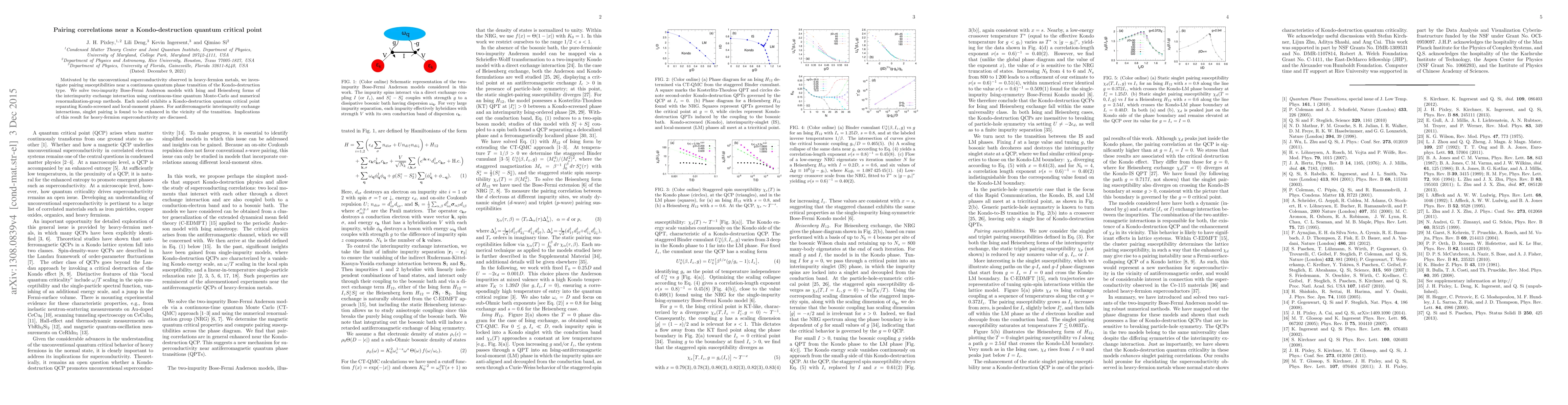 Motivated by the unconventional superconductivity observed in heavy-fermion metals, we investigate pairing susceptibilities near a continuous quantum phase transition of the Kondo-destruction type. We solve two-impurity Bose-Fermi Anderson models with Ising and Heisenberg forms of the interimpurity exchange interaction using continuous-time quantum Monte-Carlo and numerical renormalization-group methods. Each model exhibits a Kondo-destruction quantum critical point separating Kondo-screened and local-moment phases. For antiferromagnetic interimpurity exchange interactions, singlet pairing is found to be enhanced in the vicinity of the transition. Implications of this result for heavy-fermion superconductivity are discussed.