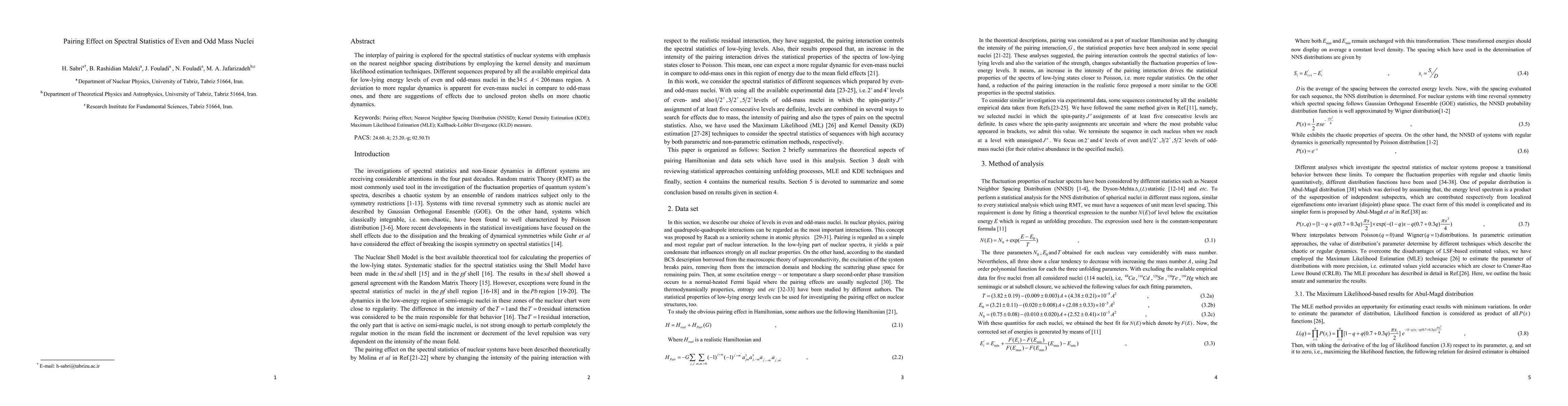 Summary: This study investigates the impact of pairing on spectral statistics in nuclear systems, focusing on nearest neighbor spacing distributions using advanced statistical techniques. Results show that even-mass nuclei exhibit more regular dynamics compared to odd-mass nuclei, suggesting unclosed proton shells contribute to chaotic dynamics.