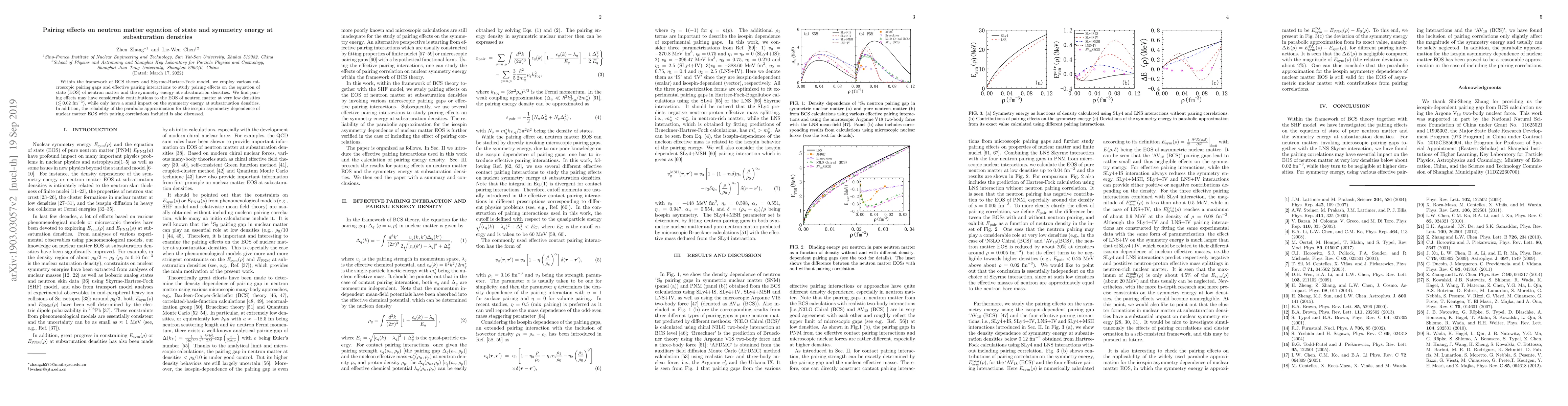 This paper investigates the impact of pairing effects on the equation of state and symmetry energy of neutron matter using BCS theory and Skyrme-Hartree-Fock model. It finds significant contributions from pairing at very low densities, while having minimal effects on the symmetry energy at subsaturation densities.