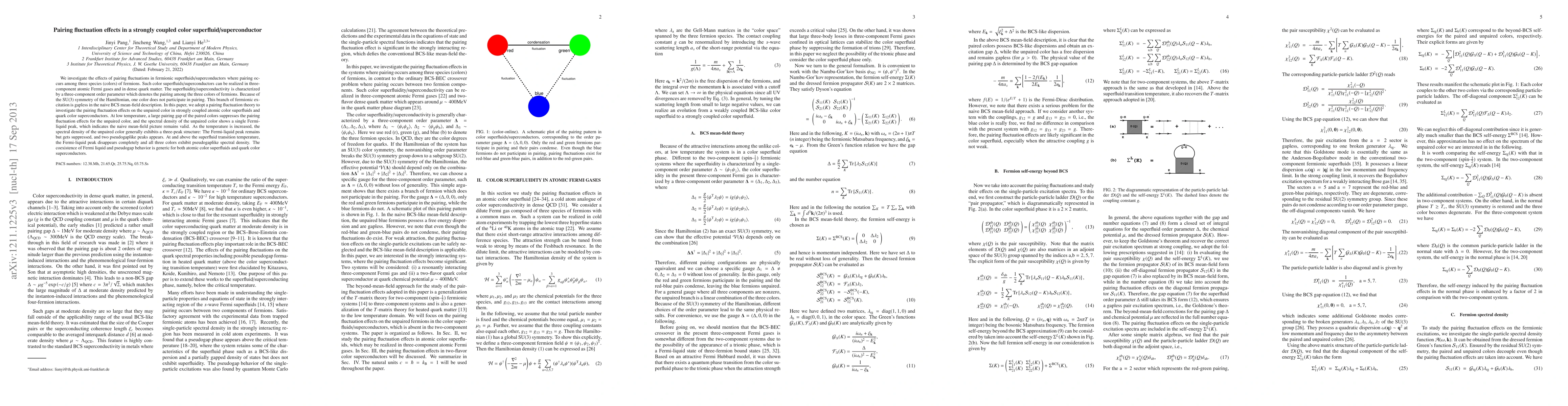 We investigate the effects of pairing fluctuations in fermionic superfluids/superconductors where pairing occurs among three species (colors) of fermions. Such color superfluids/superconductors can be realized in three-component atomic Fermi gases and in dense quark matter. The superfluidity/superconductivity is characterized by a three-component order parameter which denotes the pairing among the three colors of fermions. Due to the SU$(3)$ symmetry of the Hamiltonian, one color does not participate pairing. This branch of fermionic excitation is gapless in the naive BCS mean-field description. In this paper, we adopt a pairing-fluctuation theory to investigate the pairing fluctuation effects on the unpaired color in strongly coupled atomic color superfluids and quark color superconductors. At low temperature, a large pairing gap of the paired colors suppresses the pairing fluctuation effects for the unpaired color, and the spectral density of the unpaired color shows a single Fermi-liquid peak, which indicates the naive mean-field picture remains valid. As the temperature is increased, the spectral density of the unpaired color generally exhibits a three-peak structure: the Fermi-liquid peak remains but get suppressed, and two pseudogap-like peaks appears. At and above the superfluid transition temperature, the Fermi-liquid peak disappears completely and the all three colors exhibits pseudogap-like spectral density. The coexistence of Fermi liquid and pseudogap behavior is generic for both atomic color superfluids and quark color superconductors.