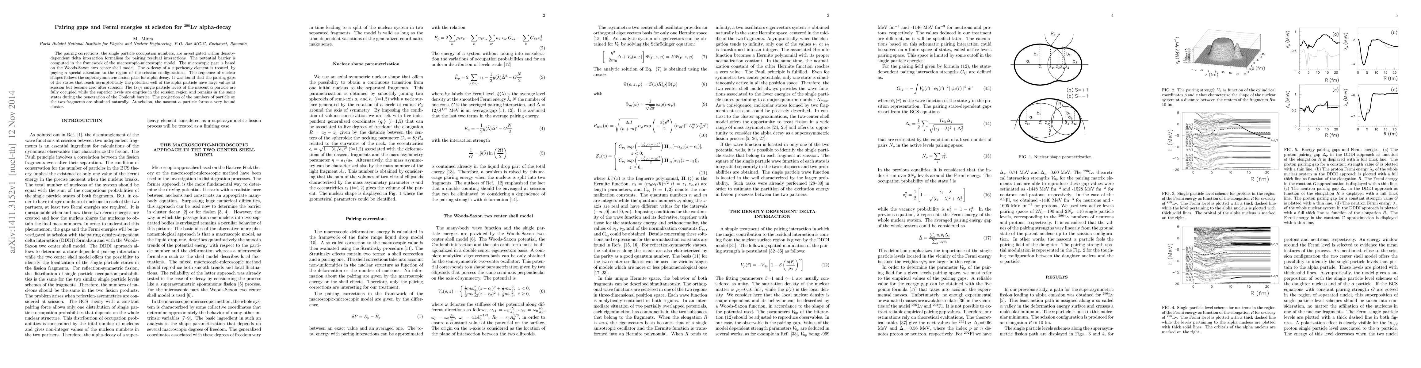 This study investigates pairing corrections and Fermi energies during the alpha-decay of superheavy 296Lv, focusing on the scission configurations. It reveals that pairing gaps are significant at scission but vanish post-scission, with the 1s1/2 levels of the nascent alpha particle fully occupied while higher levels remain empty.