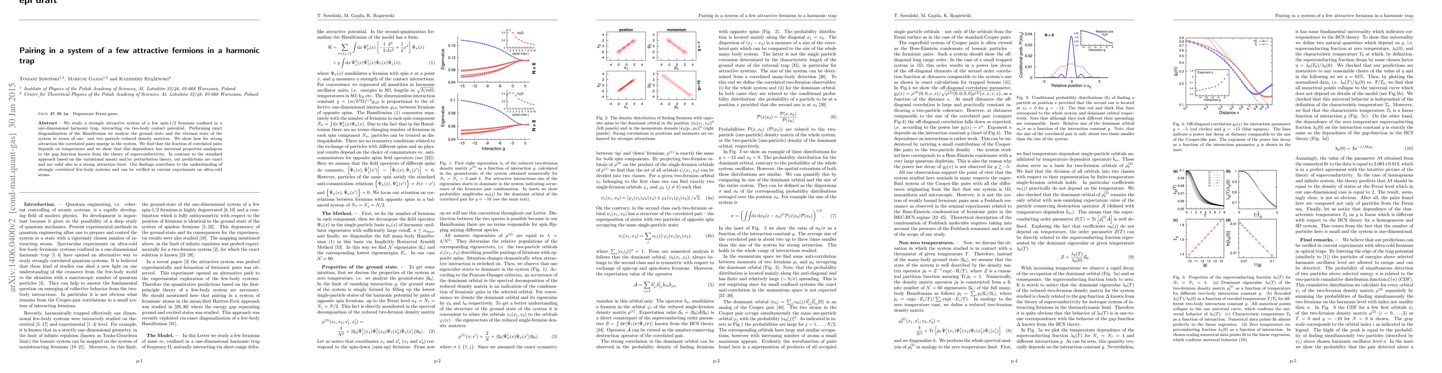 This paper presents exact diagonalization of a Hamiltonian for a few strongly attractive spin-1/2 fermions in a one-dimensional harmonic trap, revealing the emergence of correlated pairs and their temperature-dependent fraction. The findings show universal properties analogous to superconductivity and provide exact predictions valid even in strong attraction limits.