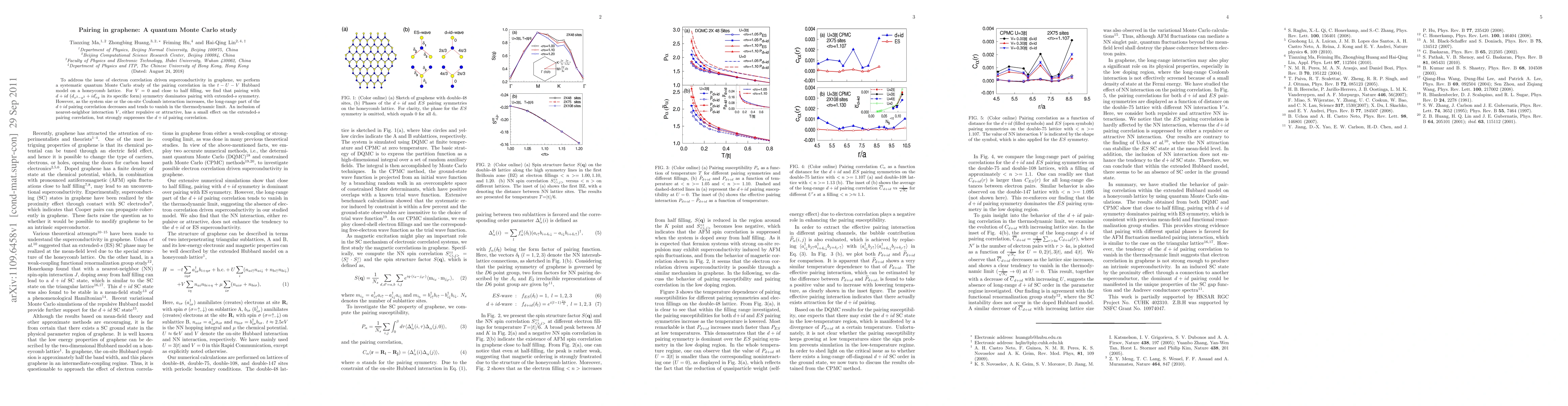 Summary: This study uses quantum Monte Carlo methods to investigate electron pairing in graphene, finding that d+id symmetry dominates over extended-s symmetry near half filling. However, as on-site interactions increase, the d+id pairing weakens, while nearest-neighbor interactions primarily affect the d+id pairing rather than extended-s pairing.