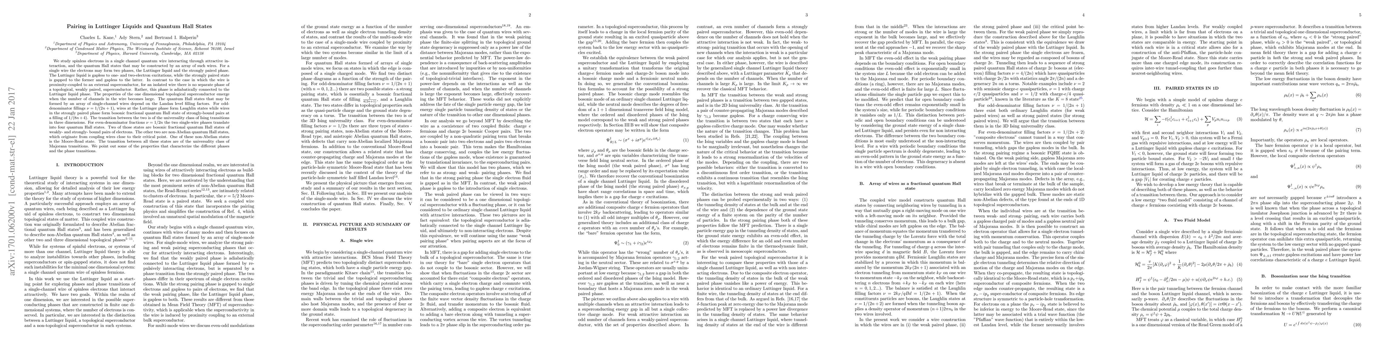 We study spinless electrons in a single channel quantum wire interacting through attractive interaction, and the quantum Hall states that may be constructed by an array of such wires. For a single wire the electrons may form two phases, the Luttinger liquid and the strongly paired phase. The Luttinger liquid is gapless to one- and two-electron excitations, while the strongly paired state is gapped to the former and gapless to the latter. In contrast to the case in which the wire is proximity-coupled to an external superconductor, for an isolated wire there is no separate phase of a topological, weakly paired, superconductor. Rather, this phase is adiabatically connected to the Luttinger liquid phase. The properties of the one dimensional topological superconductor emerge when the number of channels in the wire becomes large. The quantum Hall states that may be formed by an array of single-channel wires depend on the Landau level filling factors. For odd-denominator fillings $\nu=1/(2n+1)$, wires at the Luttinger phase form Laughlin states while wires in the strongly paired phase form bosonic fractional quantum Hall state of strongly-bound pairs at a filling of $1/(8n+4)$. The transition between the two is of the universality class of Ising transitions in three dimensions. For even-denominator fractions $\nu=1/2n$ the two single-wire phases translate into four quantum Hall states. Two of those states are bosonic fractional quantum Hall states of weakly- and strongly- bound pairs of electrons. The other two are non-Abelian quantum Hall states, which originate from coupling wires close to their critical point. One of these non-Abelian states is the Moore-Read state. The transition between all these states are of the universality class of Majorana transitions. We point out some of the properties that characterize the different phases and the phase transitions.