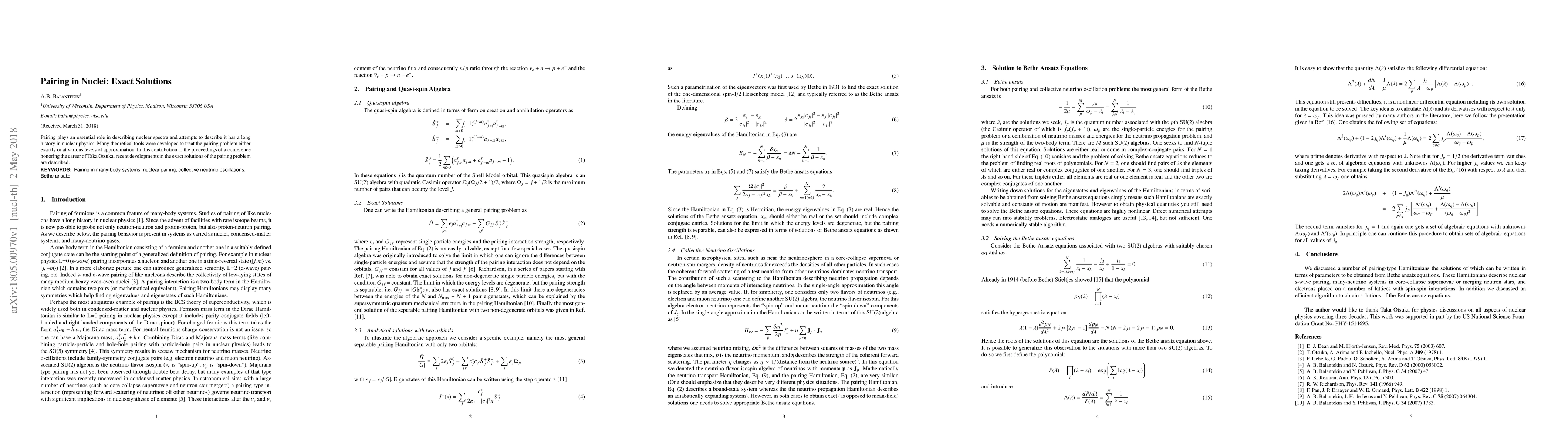 This paper reviews recent advancements in the exact solutions of nuclear pairing, a fundamental aspect in nuclear spectra, honoring the contributions of Taka Otsuka in the field. It highlights theoretical developments that provide precise solutions to the pairing problem.
