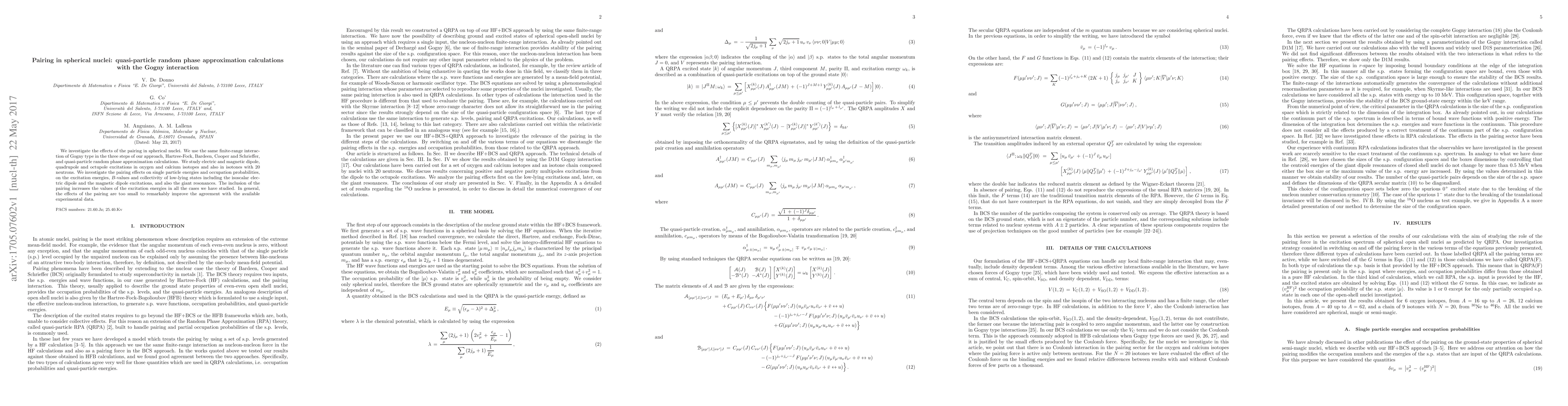We investigate the effects of the pairing in spherical nuclei. We use the same finite-range interaction of Gogny type in the three steps of our approach, Hartree-Fock, Bardeen, Cooper and Schrieffer, and quasi-particle random phase approximation calculations. We study electric and magnetic dipole, quadrupole and octuple excitations in oxygen and calcium isotopes and also in isotopes with 20 neutrons. We investigate the pairing effects on single particle energies and occupation probabilities, on the excitation energies, $B$-values and collectivity of low-lying states including the isoscalar electric dipole and the magnetic dipole excitations, and also the giant resonances. The inclusion of the pairing increases the values of the excitation energies in all the cases we have studied. In general, the effects of the pairing are too small to remarkably improve the agreement with the available experimental data.