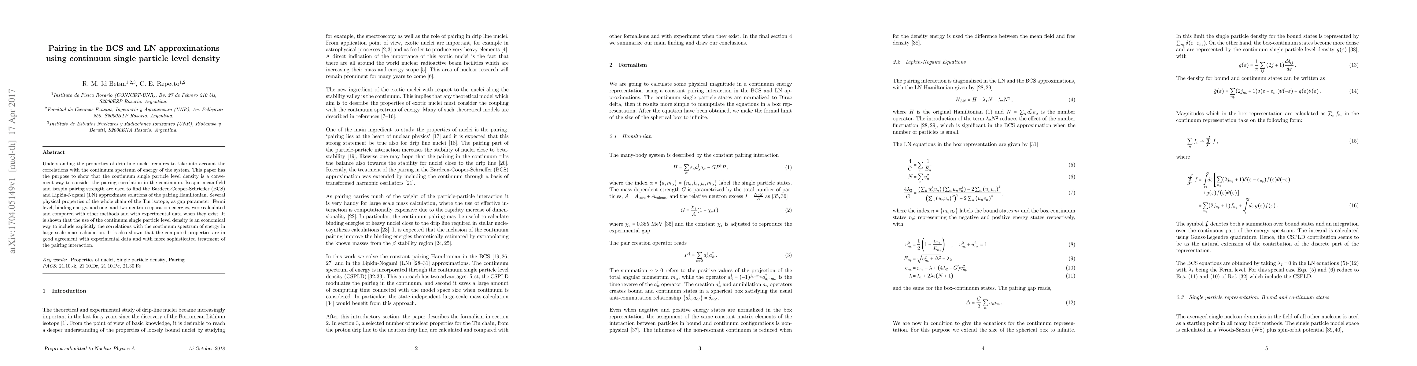 Understanding the properties of drip line nuclei requires to take into account the correlations with the continuum spectrum of energy of the system. This paper has the purpose to show that the continuum single particle level density is a convenient way to consider the pairing correlation in the continuum. Isospin mean-field and isospin pairing strength are used to find the Bardeen-Cooper-Schrieffer (BCS) and Lipkin-Nogami (LN) approximate solutions of the pairing Hamiltonian. Several physical properties of the whole chain of the Tin isotope, as gap parameter, Fermi level, binding energy, and one- and two-neutron separation energies, were calculated and compared with other methods and with experimental data when they exist. It is shown that the use of the continuum single particle level density is an economical way to include explicitly the correlations with the continuum spectrum of energy in large scale mass calculation. It is also shown that the computed properties are in good agreement with experimental data and with more sophisticated treatment of the pairing interaction.