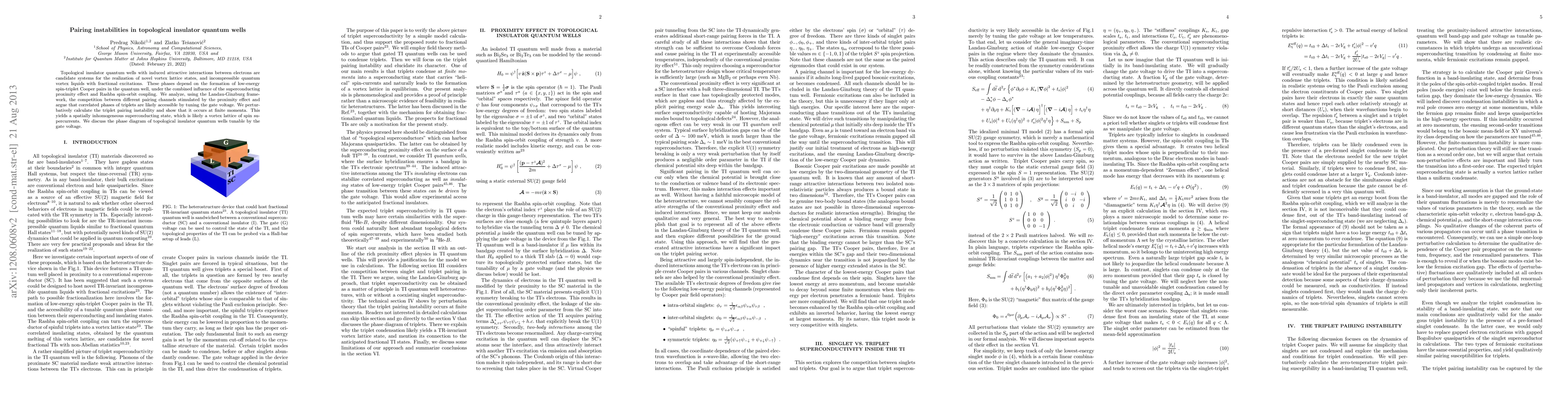 Topological insulator quantum wells with induced attractive interactions between electrons are candidate systems for the realization of novel vortex lattice states with time-reversal symmetry, and incompressible quantum vortex liquids with fractional excitations. We analyze the competition between different pairing channels stimulated by the superconducting proximity effect in these quantum wells, and calculate the helical triplet pairing instability that can produce the mentioned phases using perturbation theory. We discuss the phase diagram tunable by gate voltage.