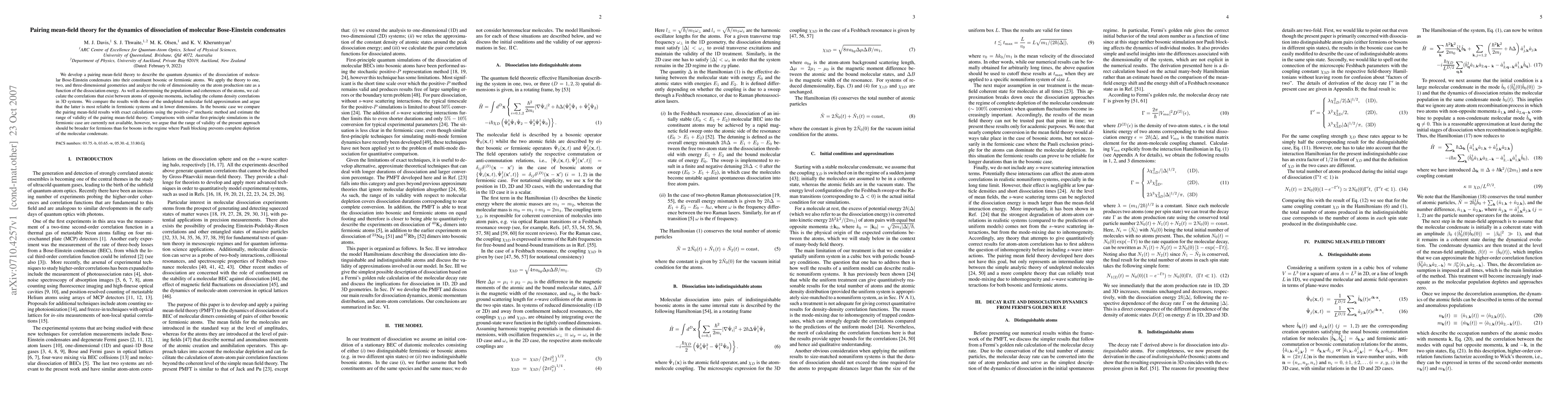 This paper develops a pairing mean-field theory to study the dissociation of molecular Bose-Einstein condensates into constituent atoms, analyzing dimensionality effects and comparing results with the undepleted molecular field approximation and exact calculations. The theory's applicability is argued to be broader for fermions than bosons in regimes where Pauli blocking occurs.