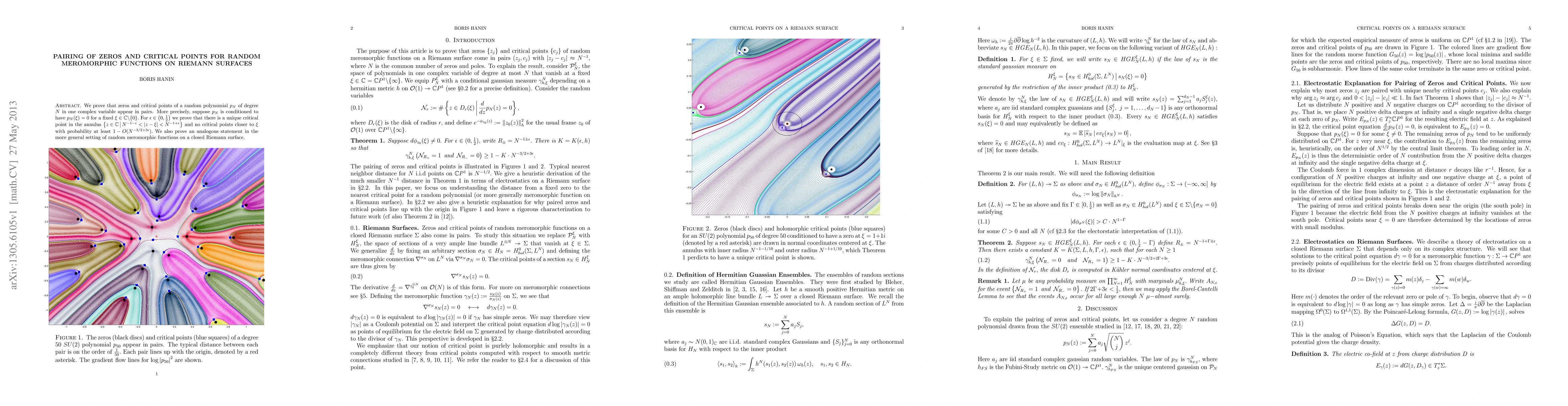 This paper demonstrates that zeros and critical points of random polynomials and meromorphic functions on Riemann surfaces appear in pairs, showing that under certain conditions, there is a unique critical point near a fixed zero with high probability. The results extend to random meromorphic functions on closed Riemann surfaces.