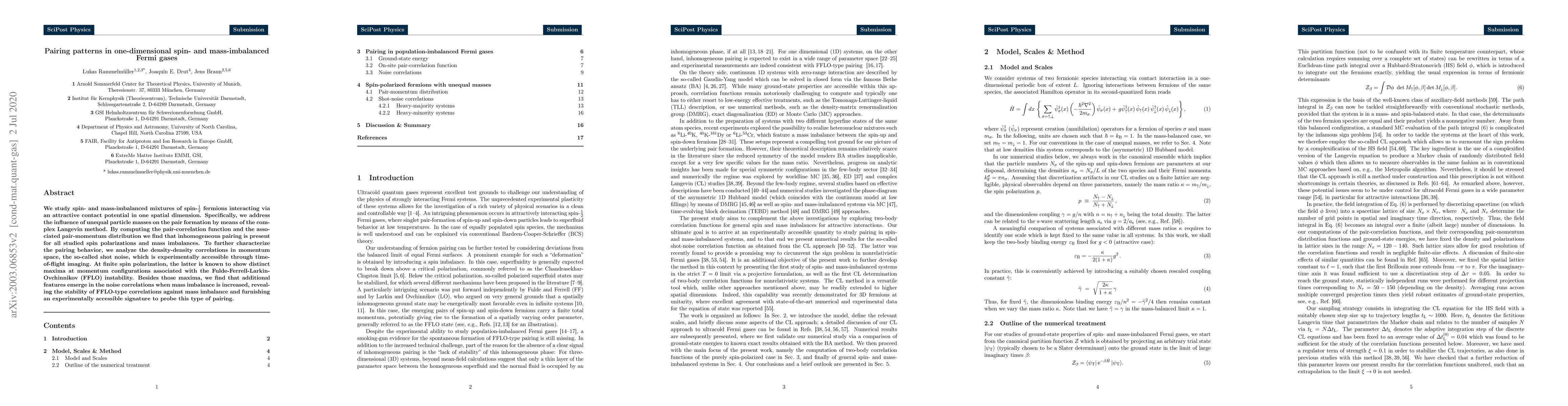 This paper investigates spin- and mass-imbalanced Fermi gases in one dimension, revealing inhomogeneous pairing through the complex Langevin method. It finds distinct shot noise features associated with the Fulde-Ferrell-Larkin-Ovchinnikov instability, with additional signatures emerging under increased mass imbalance, indicating the stability of FFLO-type correlations.