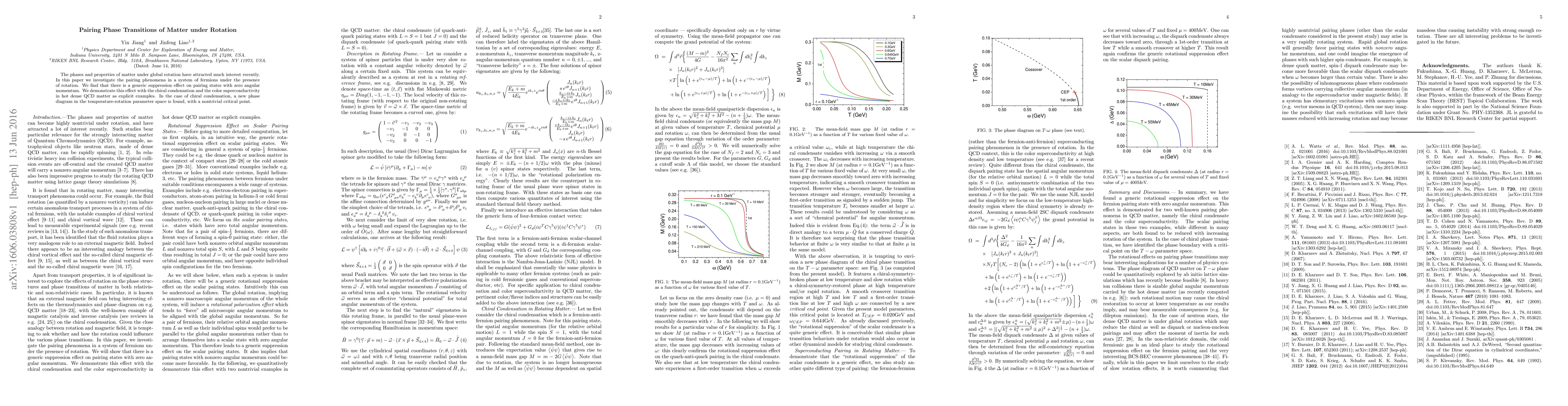 This paper explores the impact of global rotation on pairing phenomena in fermionic systems, revealing a suppression effect on zero angular momentum pairing states. It specifically examines chiral condensation and color superconductivity in hot dense QCD matter, identifying a new phase diagram with a critical point in the temperature-rotation parameter space.