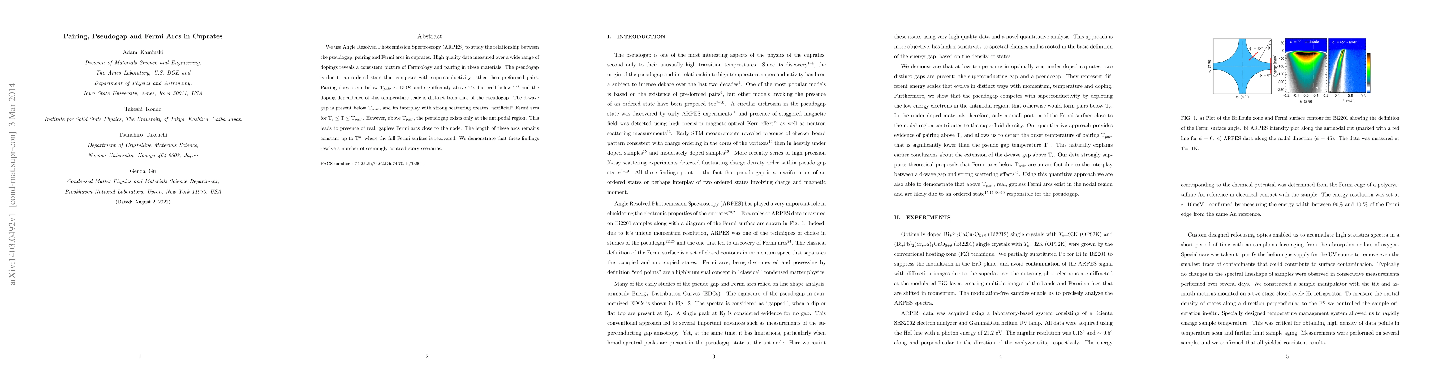 The paper presents a comprehensive analysis of ARPES data, revealing the distinct nature and temperature dependence of the pseudogap, pairing, and Fermi arcs in cuprates.