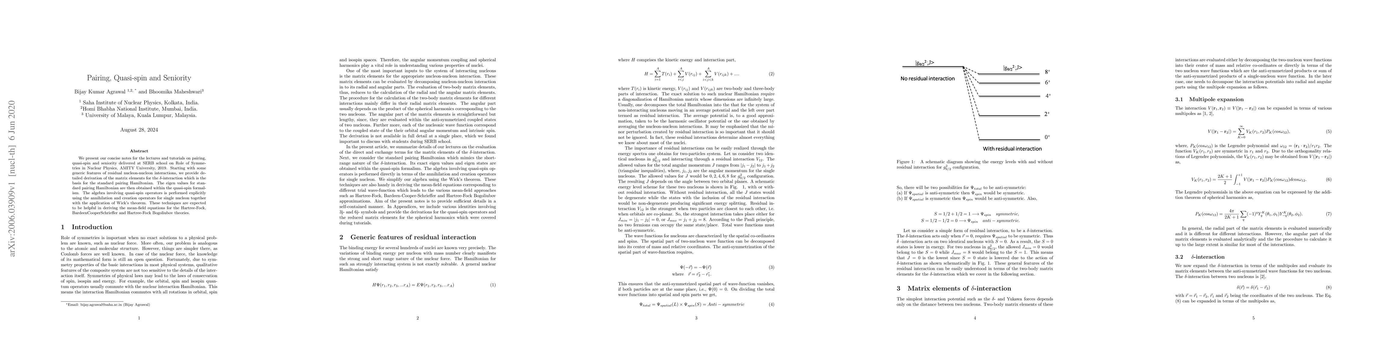 We present our concise notes for the lectures and tutorials on pairing, quasi-spin and seniority delivered at SERB school on Role of Symmetries in Nuclear Physics, AMITY University, $2019$. Starting with some generic features of residual nucleon-nucleon interactions, we provide detailed derivation of the matrix elements for the $\delta$-interaction which is the basis for the standard pairing Hamiltonian. The eigen values for standard pairing Hamiltonian are then obtained within the quasi-spin formalism. The algebra involving quasi-spin operators is performed explicitly using the annihilation and creation operators for single nucleon together with the application of Wicks theorem. These techniques are expected to be helpful in deriving the mean-field equations for the $Hartree-Fock$, $Bardeen-Cooper-Schrieffer$ and $Hartree-Fock$ Bogoliubov theories.