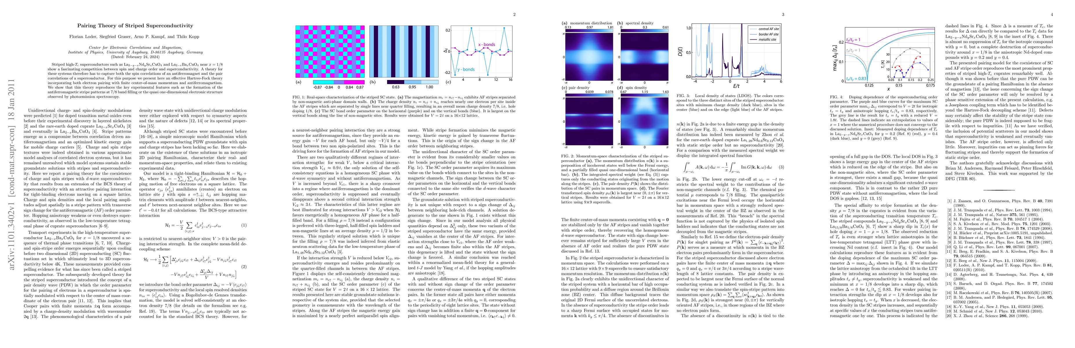 Striped high-$T_{\rm c}$ superconductors such as La$_{2-y-x}$Nd$_{y}$Sr$_x$CuO$_4$ and La$_{2-x}$Ba$_{x}$CuO$_4$ near $x=1/8$ show a fascinating competition between spin and charge order and superconductivity. A theory for these systems therefore has to capture both the spin correlations of an antiferromagnet and the pair correlations of a superconductor. For this purpose we present here an effective Hartree-Fock theory incorporating both electron pairing with finite center-of-mass momentum and antiferromagnetism. We show that this theory reproduces the key experimental features such as the formation of the antiferromagnetic stripe patterns at 7/8 band filling or the quasi one-dimensional electronic structure observed by photoemission spectroscopy.