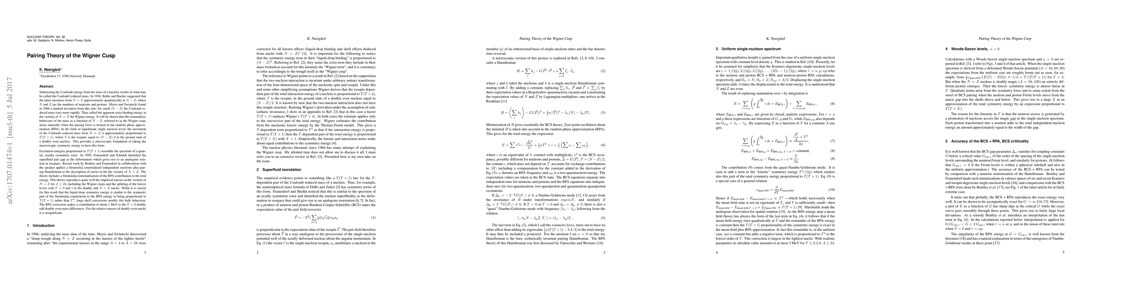 The research paper presents a Pairing Theory of the Wigner Cusp, concluding that an RPA (Random Phase Approximation) correction to the BCS (Bardeen-Cooper-Schrieffer) pairing enhances Nilsson-Strutinskij calculations for nuclear mass patterns near N=Z. The RPA correction, though minor for doubly even masses, is crucial for understanding macroscopic symmetry energy. This energy's proportionality to T(T+1) is microscopically explained by nuclear superfluidity. The cusp's shape variation is primarily due to shell effects, and the RPA correction notably decreases T=0 binding in doubly odd nuclei, thus reducing required pair coupling constant.