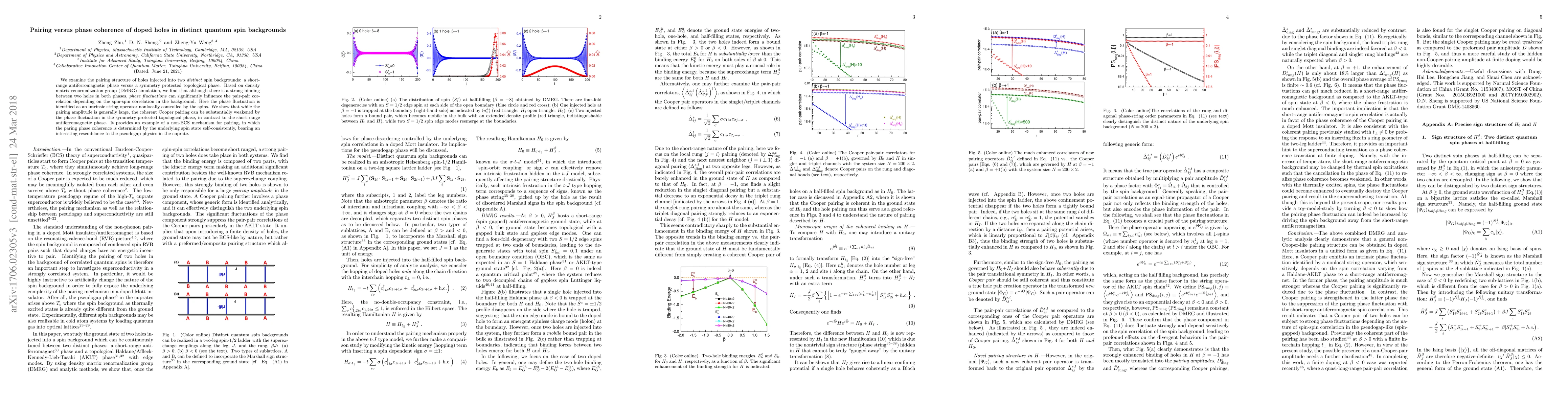 This paper investigates the pairing behavior of doped holes in two different spin backgrounds: a short-range antiferromagnetic phase and a symmetry-protected topological phase. The study reveals that while hole pairing is strong in both, phase fluctuations significantly affect pair-pair correlations, especially in the topological phase, leading to weakened coherent pairing compared to the antiferromagnetic phase.