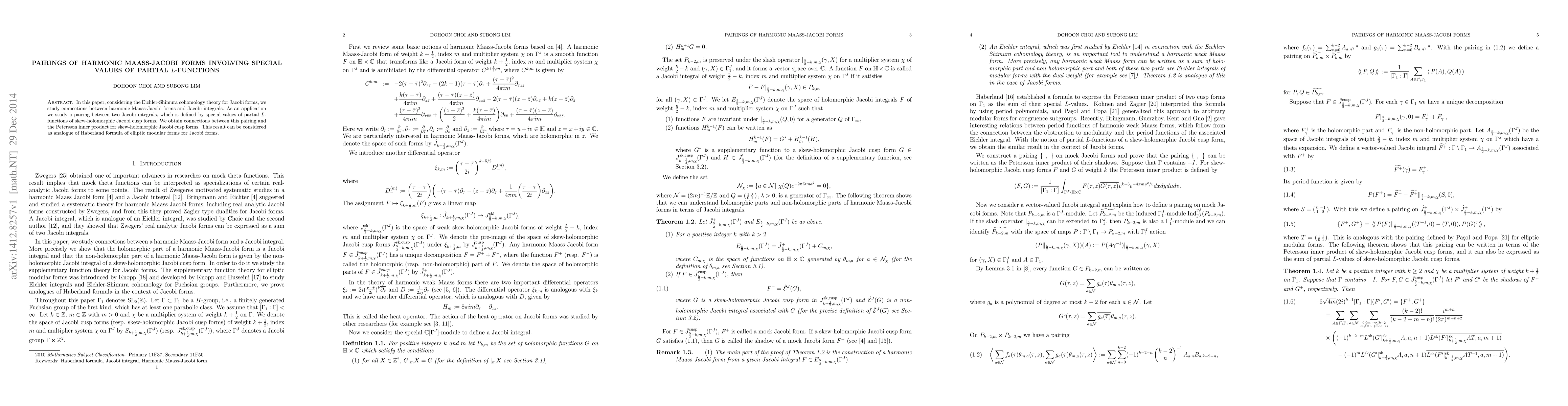 In this paper, considering the Eichler-Shimura cohomology theory for Jacobi forms, we study connections between harmonic Maass-Jacobi forms and Jacobi integrals. As an application we study a pairing between two Jacobi integrals, which is defined by special values of partial $L$-functions of skew-holomorphic Jacobi cusp forms. We obtain connections between this pairing and the Petersson inner product for skew-holomorphic Jacobi cusp forms. This result can be considered as analogue of Haberland formula of elliptic modular forms for Jacobi forms.