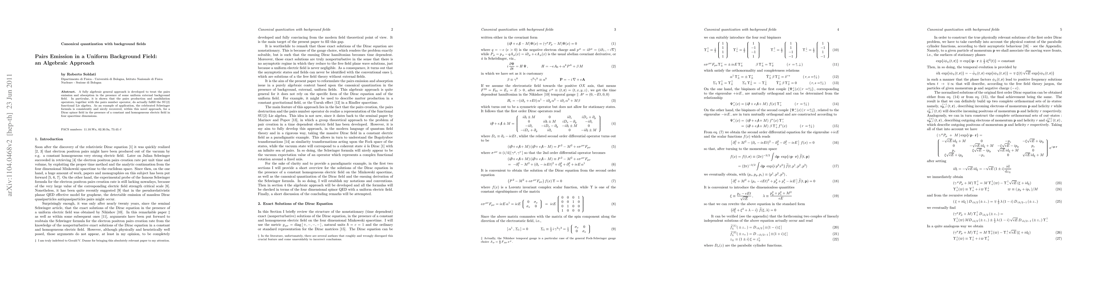 This paper develops a fully algebraic method to analyze pairs emission and absorption in a uniform background field, demonstrating that the relevant operators satisfy the SU(2) functional Lie algebra. The approach successfully recovers the Schwinger formula for a Dirac spinor field in a constant electric field.