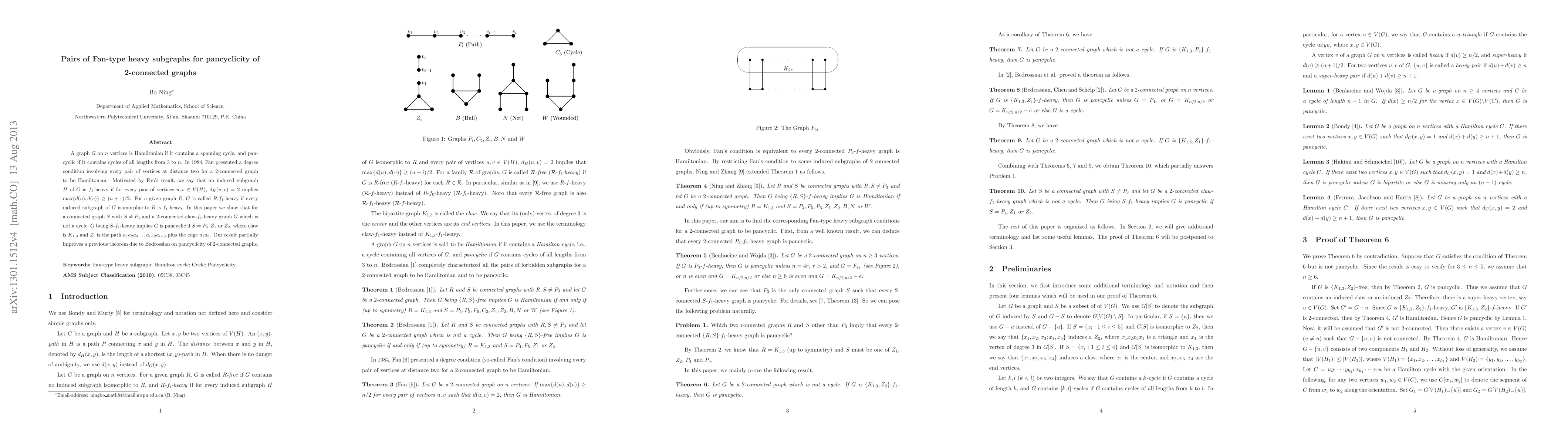 A graph $G$ on $n$ vertices is Hamiltonian if it contains a spanning cycle, and pancyclic if it contains cycles of all lengths from 3 to $n$. In 1984, Fan presented a degree condition involving every pair of vertices at distance two for a 2-connected graph to be Hamiltonian. Motivated by Fan's result, we say that an induced subgraph $H$ of $G$ is $f_1$-heavy if for every pair of vertices $u,v\in V(H)$, $d_{H}(u,v)=2$ implies $\max\{d(u),d(v)\}\geq (n+1)/2$. For a given graph $R$, $G$ is called $R$-$f_1$-heavy if every induced subgraph of $G$ isomorphic to $R$ is $f_1$-heavy. In this paper we show that for a connected graph $S$ with $S\neq P_3$ and a 2-connected claw-$f_1$-heavy graph $G$ which is not a cycle, $G$ being $S$-$f_1$-heavy implies $G$ is pancyclic if $S=P_4,Z_1$ or $Z_2$, where claw is $K_{1,3}$ and $Z_i$ is the path $a_1a_2a_3... a_{i+2}a_{i+3}$ plus the edge $a_1a_3$. Our result partially improves a previous theorem due to Bedrossian on pancyclicity of 2-connected graphs.